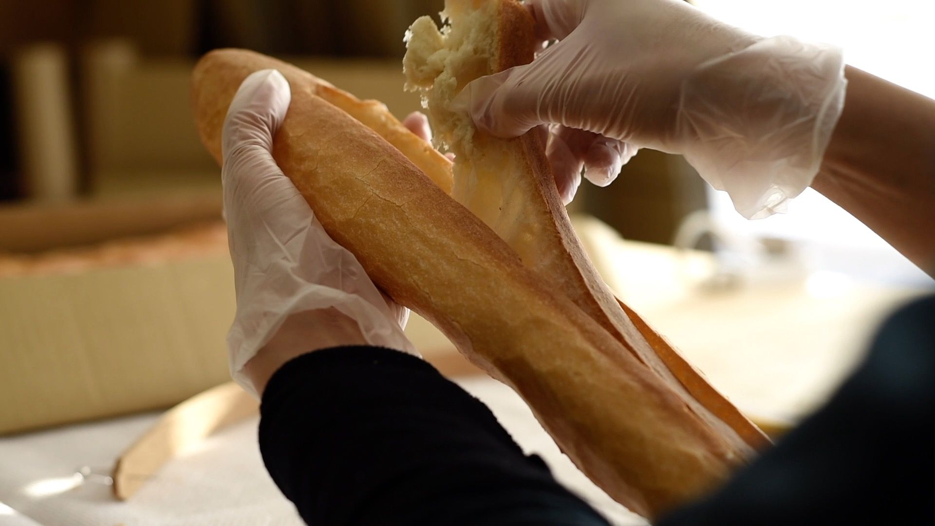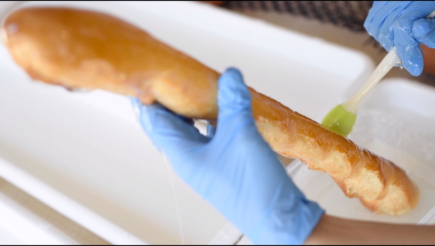 ある日、フランスパンのクラム(パンの中身の柔らかい部分)をくり抜いて食べる実験をしていたときのことです。薄くくり抜かれたパンに西日が差し込み、パンが光ったように見えた瞬間がありました。その瞬間に「これだ!」と直感しました。すぐに手元にあった卓上ランプでパンを照らしてみると、驚くほど美しく光るパンが現れました。