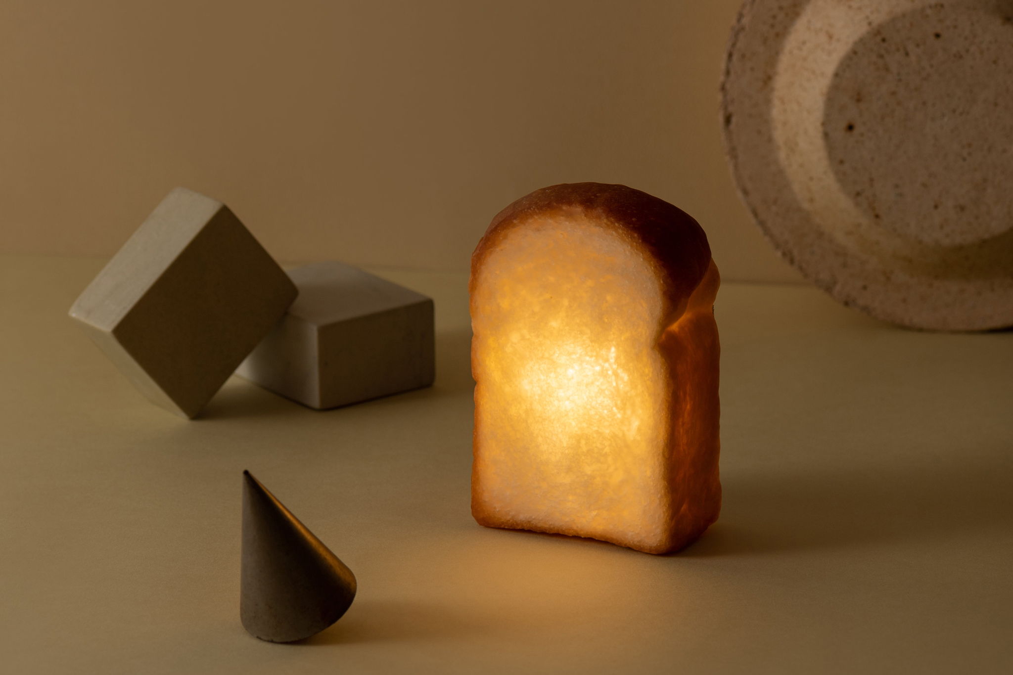 One day, we were experimenting with hollowing out the crumb (the soft part of the bread's interior) of French bread and eating it. There was a moment when the western sun shone on the thinly hollowed-out bread and the bread seemed to glow. At that moment, I had a gut feeling, "This is it! I had a gut feeling. I immediately lit up the bread with a table lamp that I had on hand, and loaves of bread that glowed surprisingly beautifully appeared.