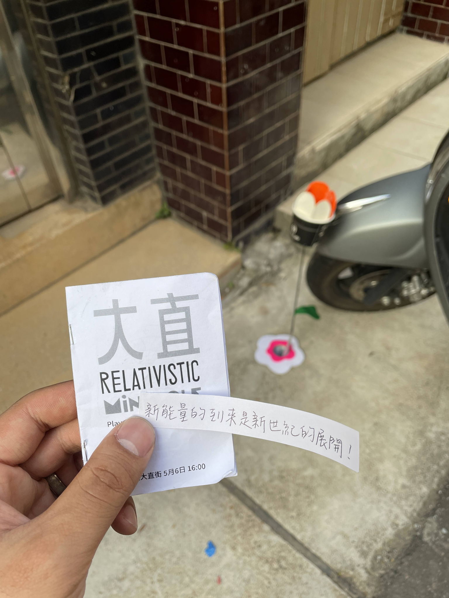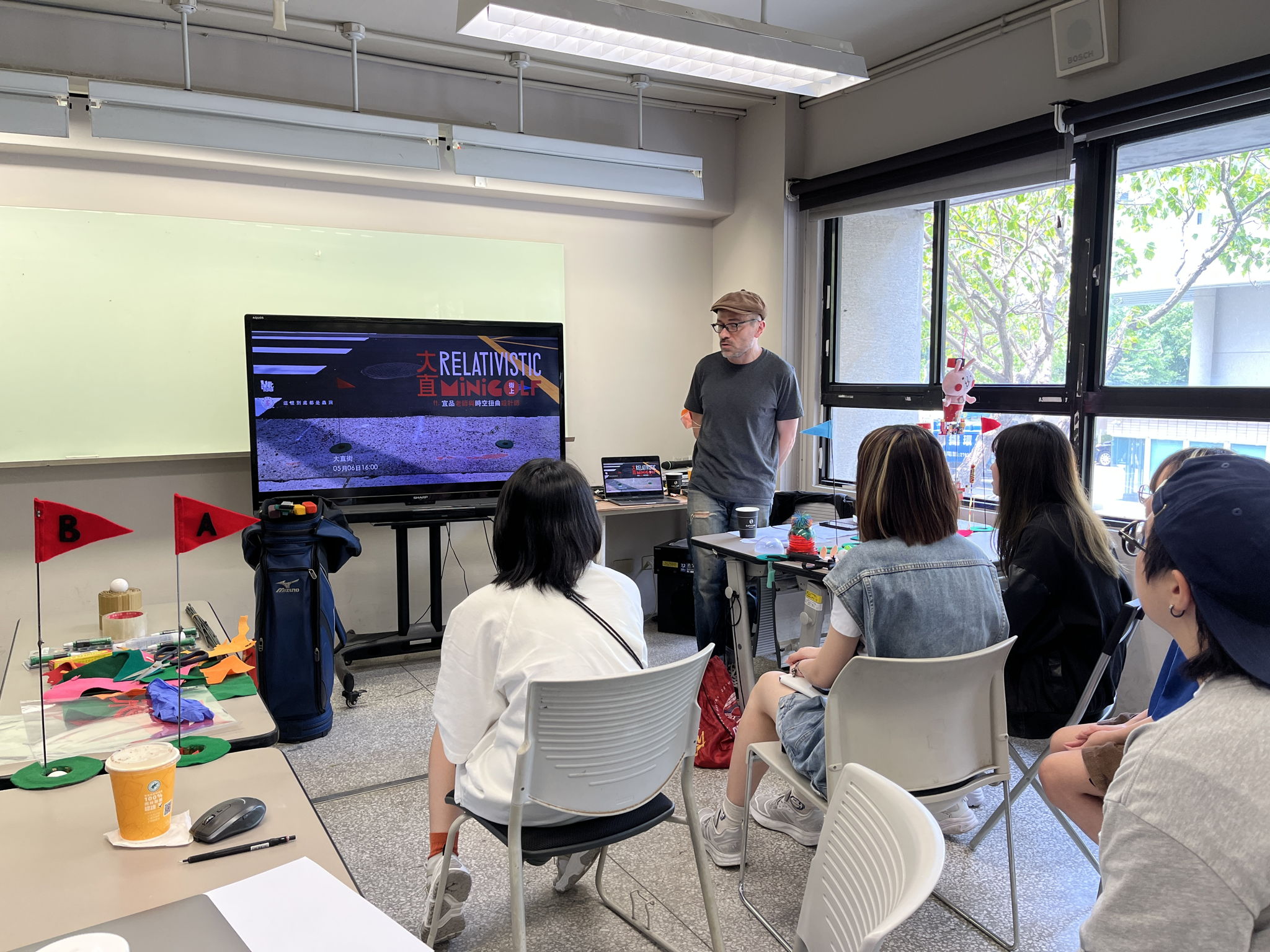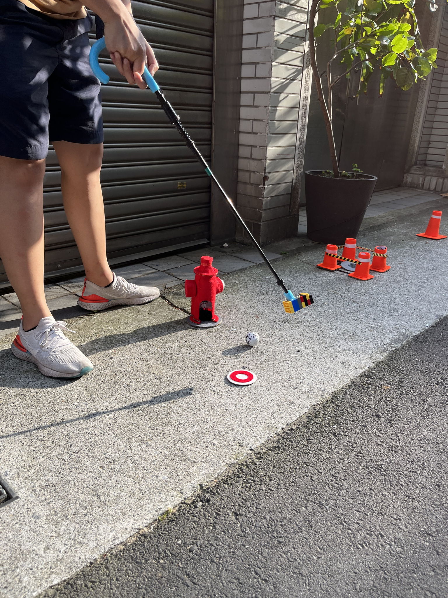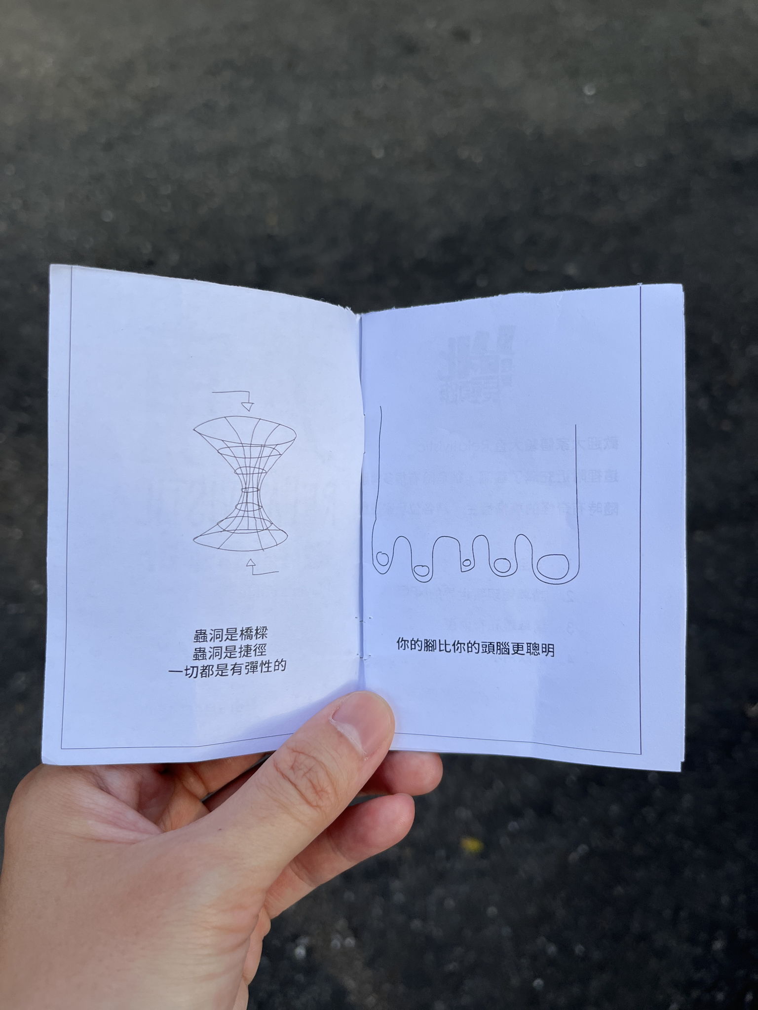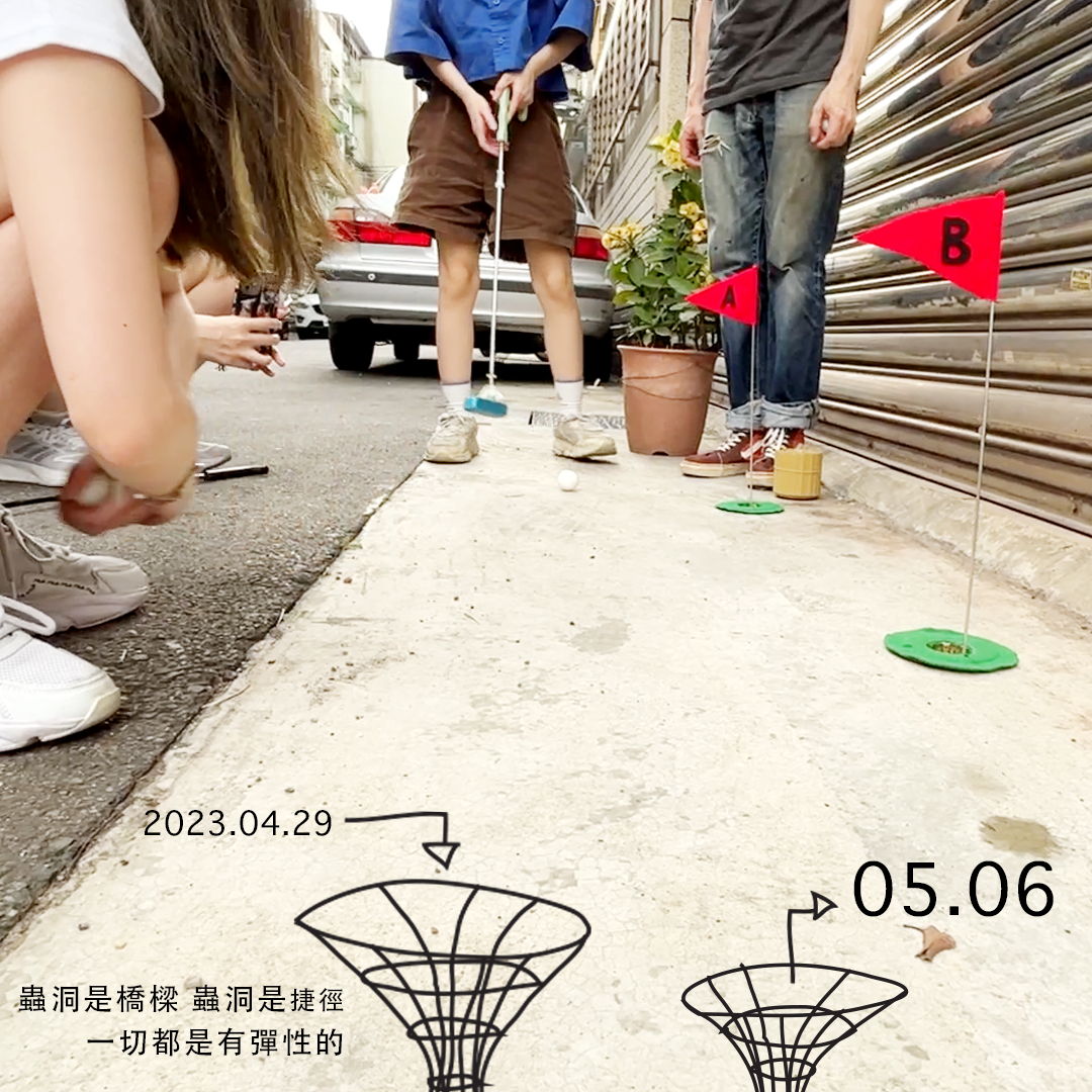 Dazhi Relativistic is a unique mini-golf experience set in Taipei, centered around the concept of curved spacetime. Imagine that Dazhi Street in Taipei is filled with wormholes. If you are a fan of spacetime, mini-golf, and the theory of general relativity, then this is the street-level golf course for you. We collaborated with five young and talented spacetime-twisting designers (葉辰芸、陳筠雯、楊明蓁、王柔珺、楊予萱) to observe small, everyday events in the Dazhi Street area, linking various locations such as daydream-friendly parks, beautiful flower shops, a letter in a mailbox, fire hydrants that spit out objects, hard-to-pick-up lost items, and poached eggs in breakfast shops, all while Schrödinger's cat drives a dangerous truck. Using trash collected from the streets, we created odd obstacles and installed them over the holes in the streets. When players putt into the holes, the wormholes offer them a surprise. On the day of the event, we prepared a total of 9 wormholes and had 12 participants. We provided each player with a special golf club and a zine guide, ensuring a fun-filled afternoon for the group. After the game ended, we also issued NFTs on Tezo as proof of attendance for the designers and players.The game is led by Alejandro Zamudio (Taipei is a giraffe), in collaboration with Yipin Huang (from IAA, NYCU).