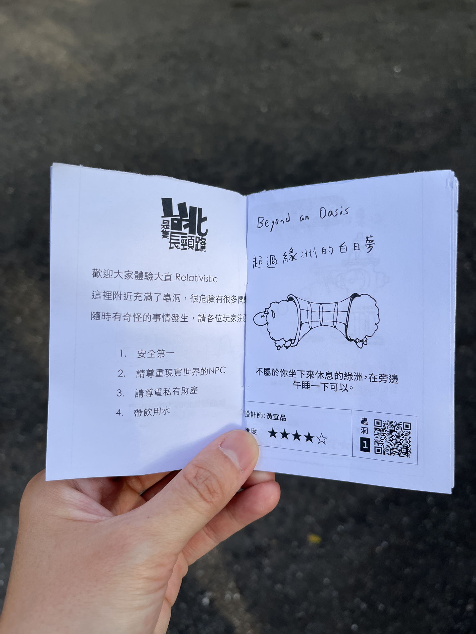 大直 relativistic 是一個關於彎曲時空迷你高爾夫體驗遊戲,想像!台北市大直街有好多蟲洞,如果你是時空、迷你高爾夫和廣義相對論的粉絲,那麼這就是適合你的街頭高爾夫球場。我們與五位年輕又有才華的時空扭曲設計師(葉辰芸、陳筠雯、楊明蓁、王柔珺、楊予萱)在大直街區觀察日常中活中的小小事件,將場域連通,例如:可以做白日夢的公園、美麗的花店、箱信中的一封信、會吐出東西的消防栓、難以撿拾的小失物、早餐店裡的荷包蛋,以薛汀格的貓正在開著危險的卡車。我們運用街道撿來的垃圾製作奇怪的障礙,安裝在街道的洞上,當玩家推桿進洞,蟲洞將給玩家一個驚喜。活動當天,我們一共準備 9 個蟲洞,有 12 位玩家參與,我們為每一個玩家準備特殊的高爾夫球桿,以及每人一本 zine 指引,使一群人有充滿回意樂趣的下午。遊戲結束後,我們也在 Tezo 發行 NFT 作為參與證明(Proof of Attendance)給設計師和玩家們。這個遊戲由台北是隻長頸鹿的艾雷電主導與黃宜品(IAA, NYCU)一起合作執行。更多活動紀錄可至台北是隻長頸鹿 Instagram: https://www.instagram.com/p/CsIREaXNs4H/