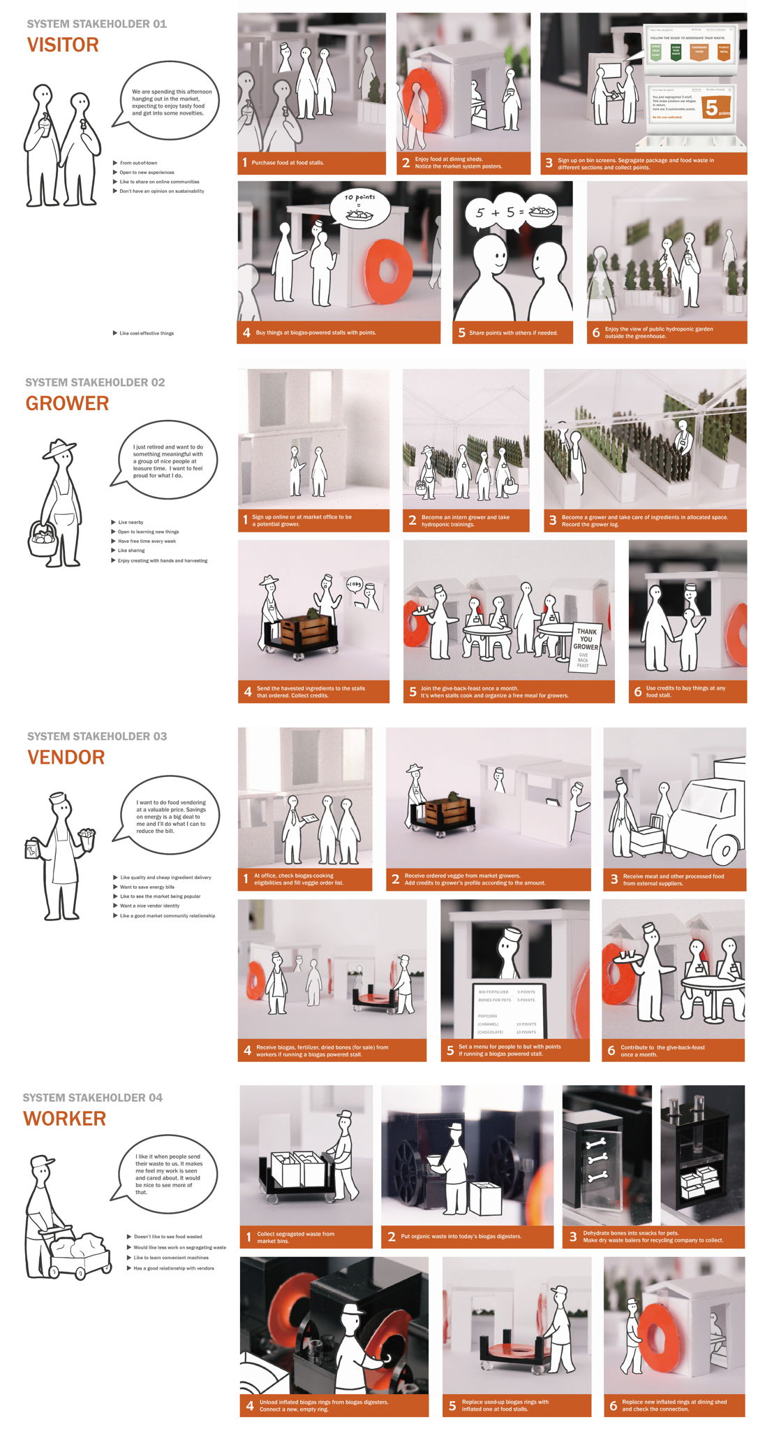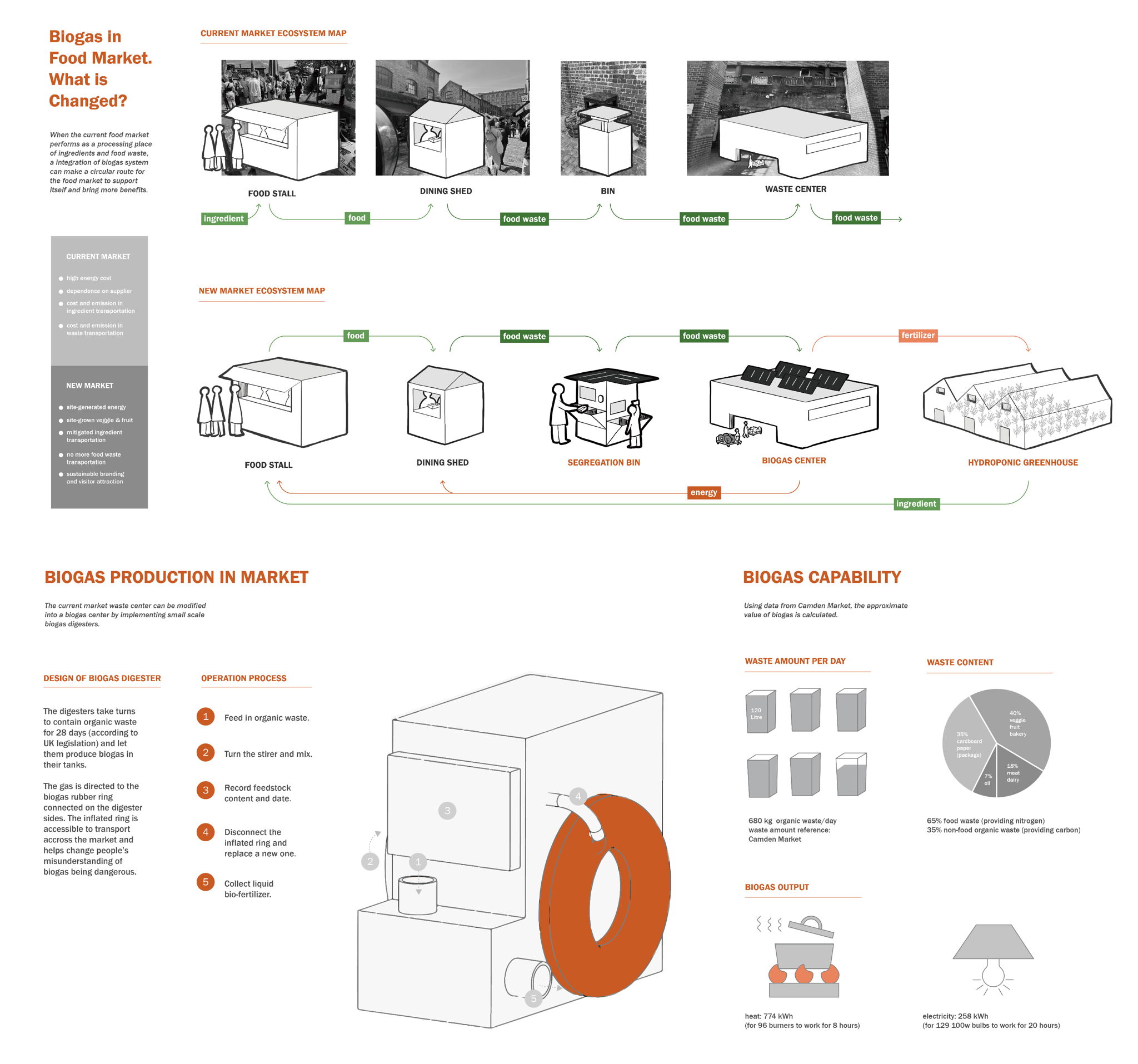"Food Market Tomorrow" is a proposal for integrating small-scale biogas digesters into current markets' waste centres. Instead of transporting the vast amount of organic waste somewhere else, the system turns the waste into energy on-site. The circular system engages visitors and local people as stakeholders at particular touchpoints and gives back rewards.