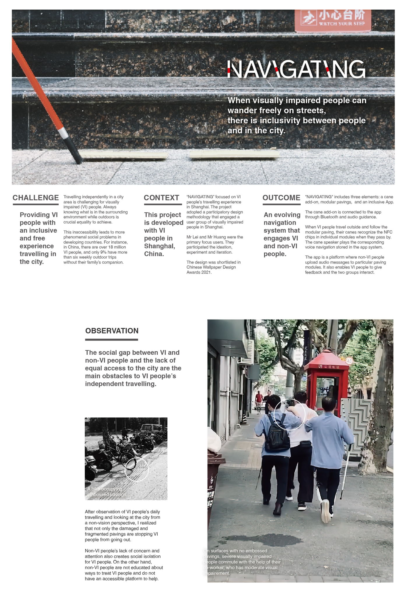 "Navigating" is a system that informs visually impaired (VI) people about the surrounding infrastructure and buildings when they walk on the streets. By installing an add-on sensor to the current walking canes, VI people can receive audio navigation when they walk past the pavers embedded with NFC. The audio messages are uploaded by volunteering citizens.