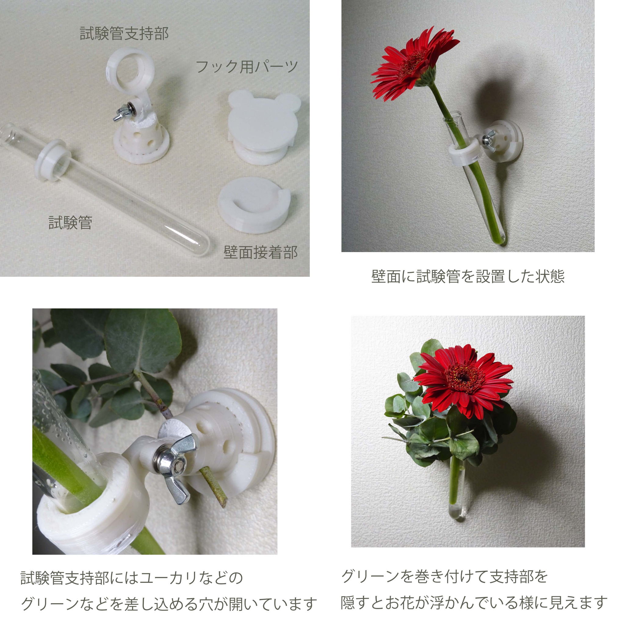 試験管を使用した空間に花を浮かべる装置。