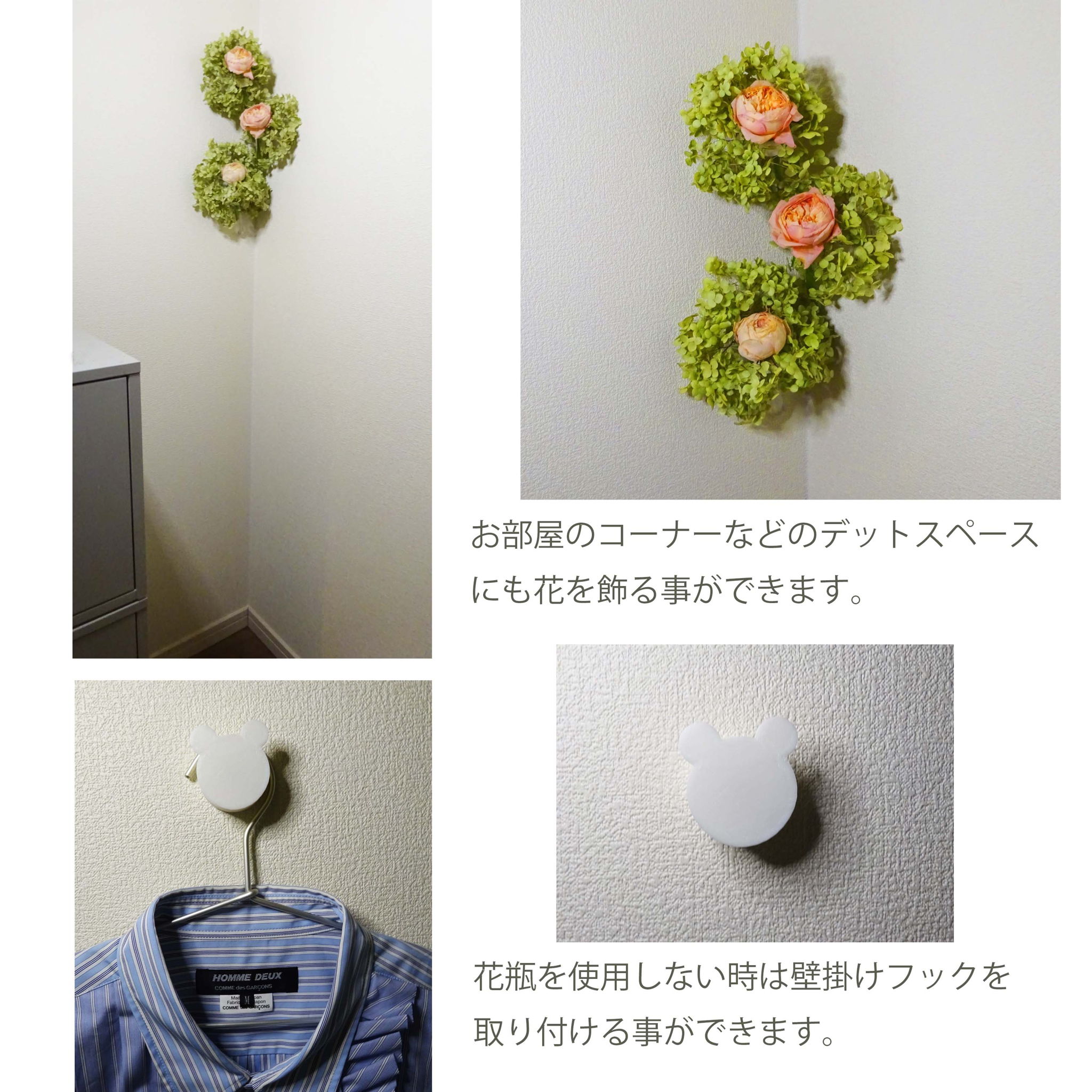壁紙用接着剤で設置できるので場所を選ばず自由にレイアウトする事ができ、従来の一輪挿しなどの花器と違った新しい空間演出が出来ます。