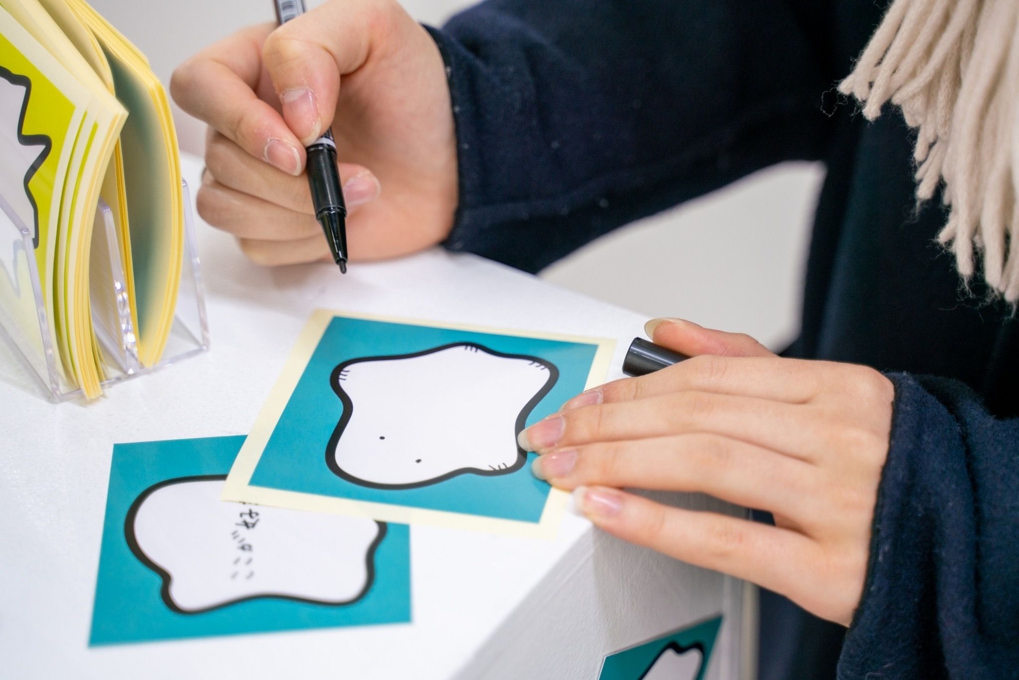 「感じたことをシールに書いて作品の周りに貼る」自分と他人がどう感じたのかを可視化し、書く・貼るという行為により、より真剣に絵と向き合う時間を生んだ。