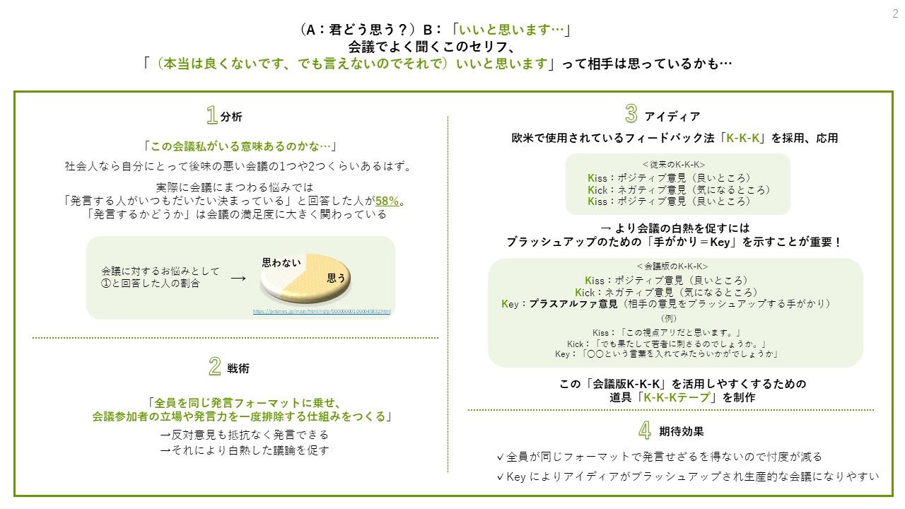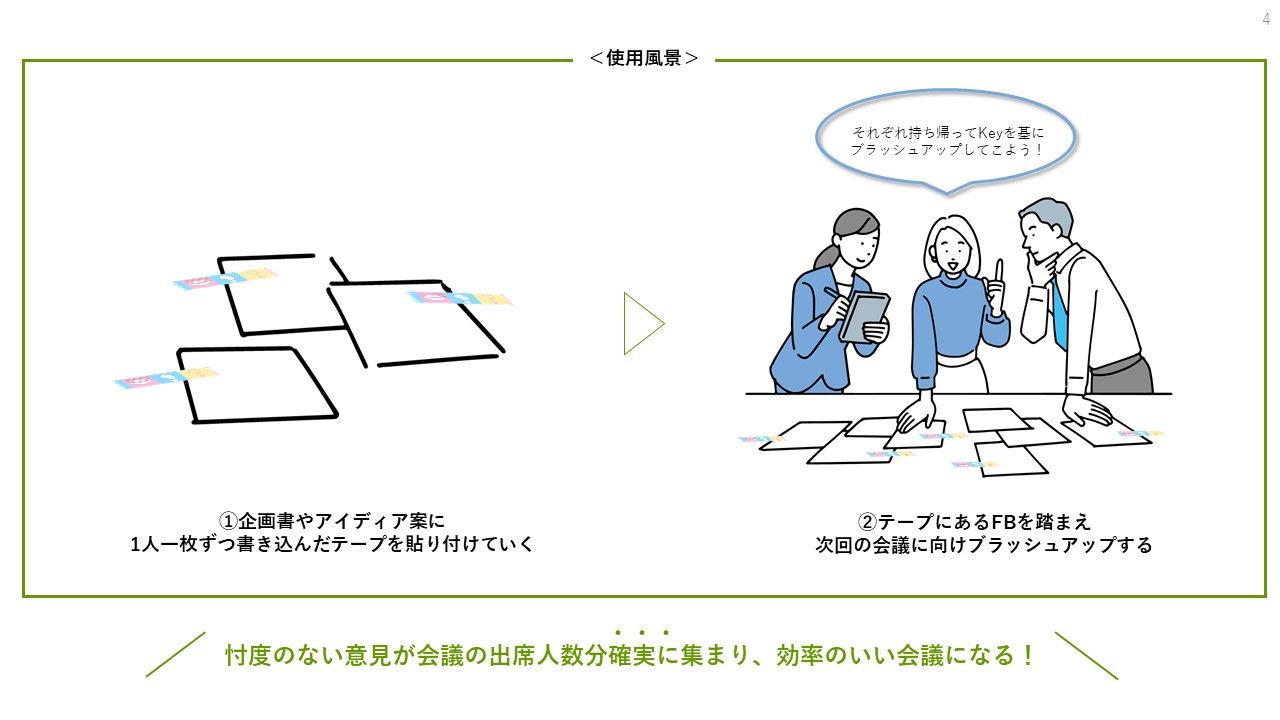 ブレストやアイディアフラッシュの会議でありがちな「いいと思います…」の応戦。忖度を少しでもなくし、年齢や立場に関係なく意見が言いやすい会議をつくるための「テープ」です。