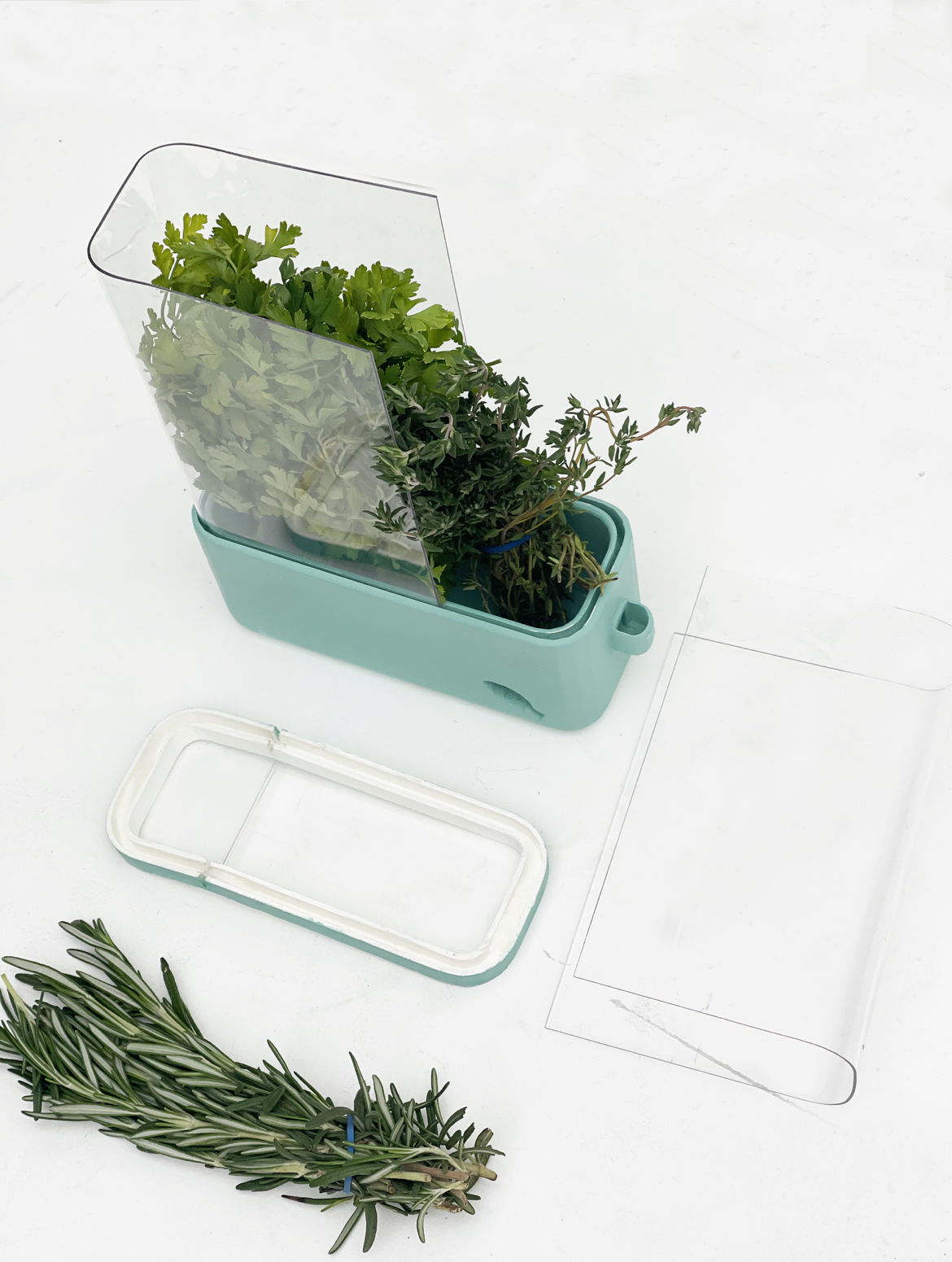 Revolutionising herb storage to minimise food waste. This product extends the lifespan of fresh-cut herbs by up to 2 weeks. With a convenient refrigerator door design, it consists of a lid for quick access, removable sides for organisation, and a water-filled base. The leaf sign indicates when to refill. Fresh N Green is ideal for individuals buying standard herb bundles that often get spoiled within 2-4 days, leading to wastage.