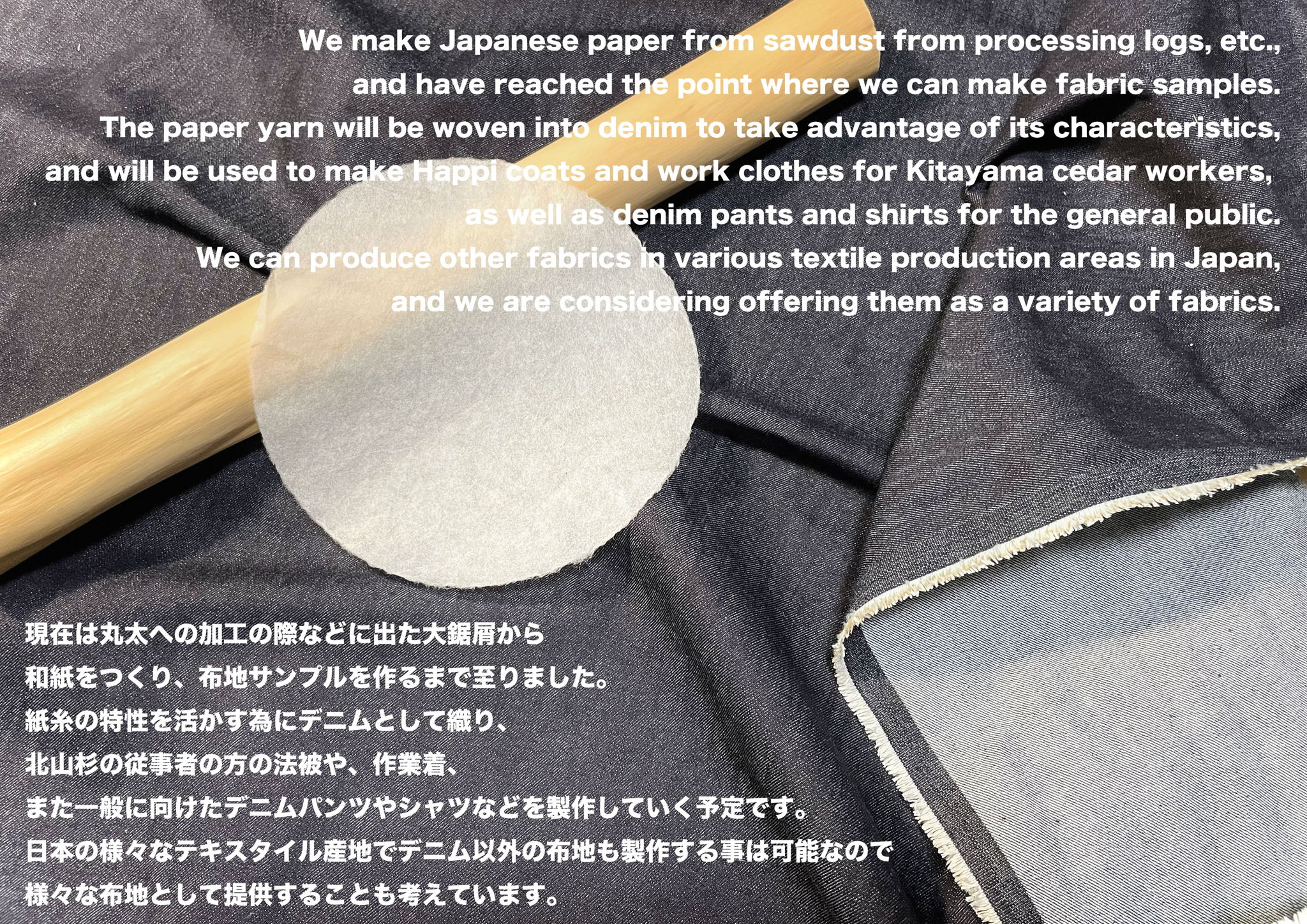 By utilizing sawdust from wood processing, damaged logs that have lost their value, and standing timber that is no longer needed for forestry, and transforming them into paper, thread, and fabric, we aim to create an environment that facilitates the transmission of techniques that have been handed down in the Nakagawa Kitayama region and increase awareness of Kitayama cedar to the younger generation who have never heard of the tree before.