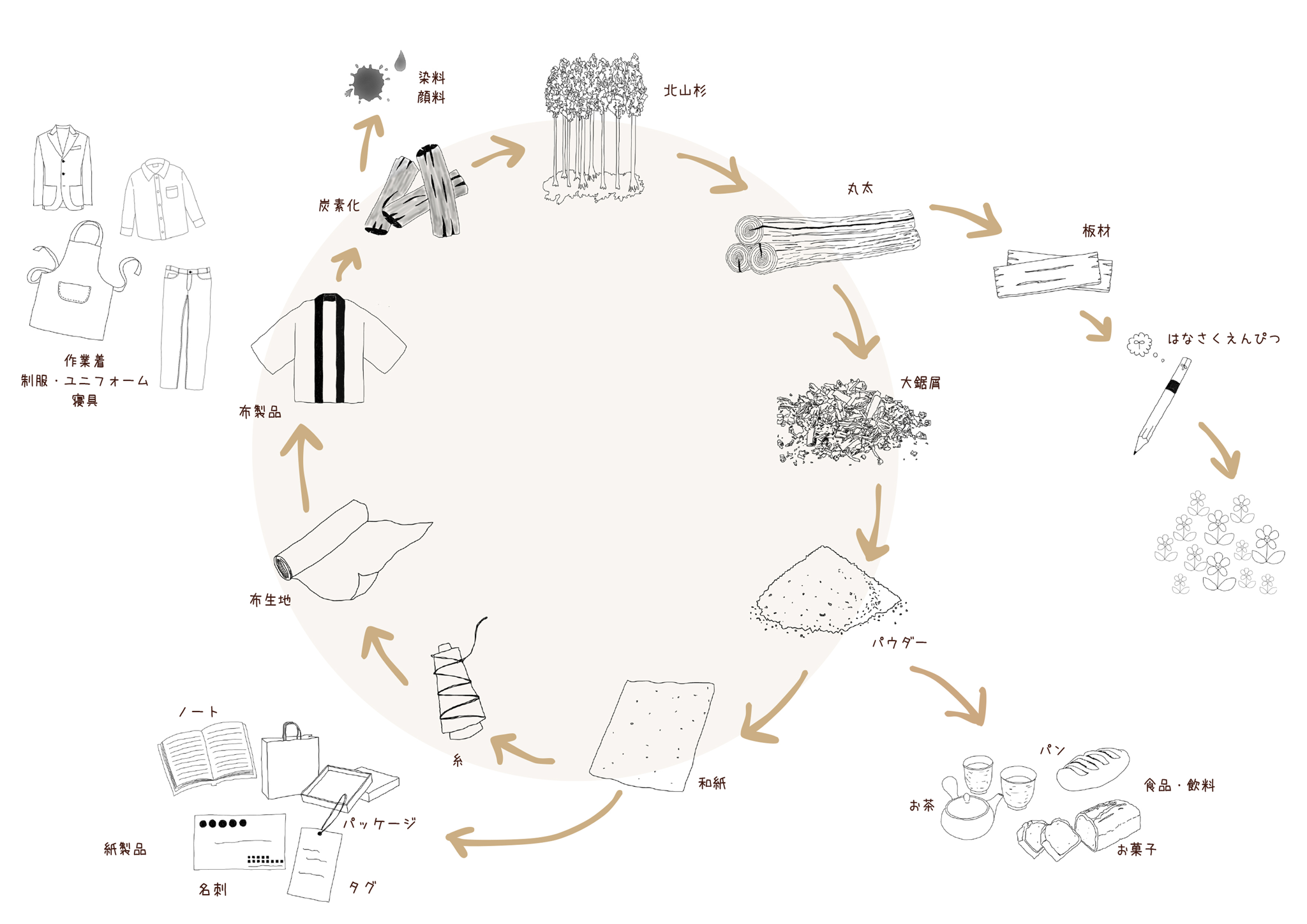 木材加工で生じた大鋸屑、傷つき価値の下がってしまった丸太、育林の為に不要となった立ち木を利用し、紙や糸、布に形を変えることで、これまで北山杉の事を知らなかった若い世代へ向け、認知の拡大と中川北山地域に続く技術の継承を行いやすい環境を創出していく事を目指します。
