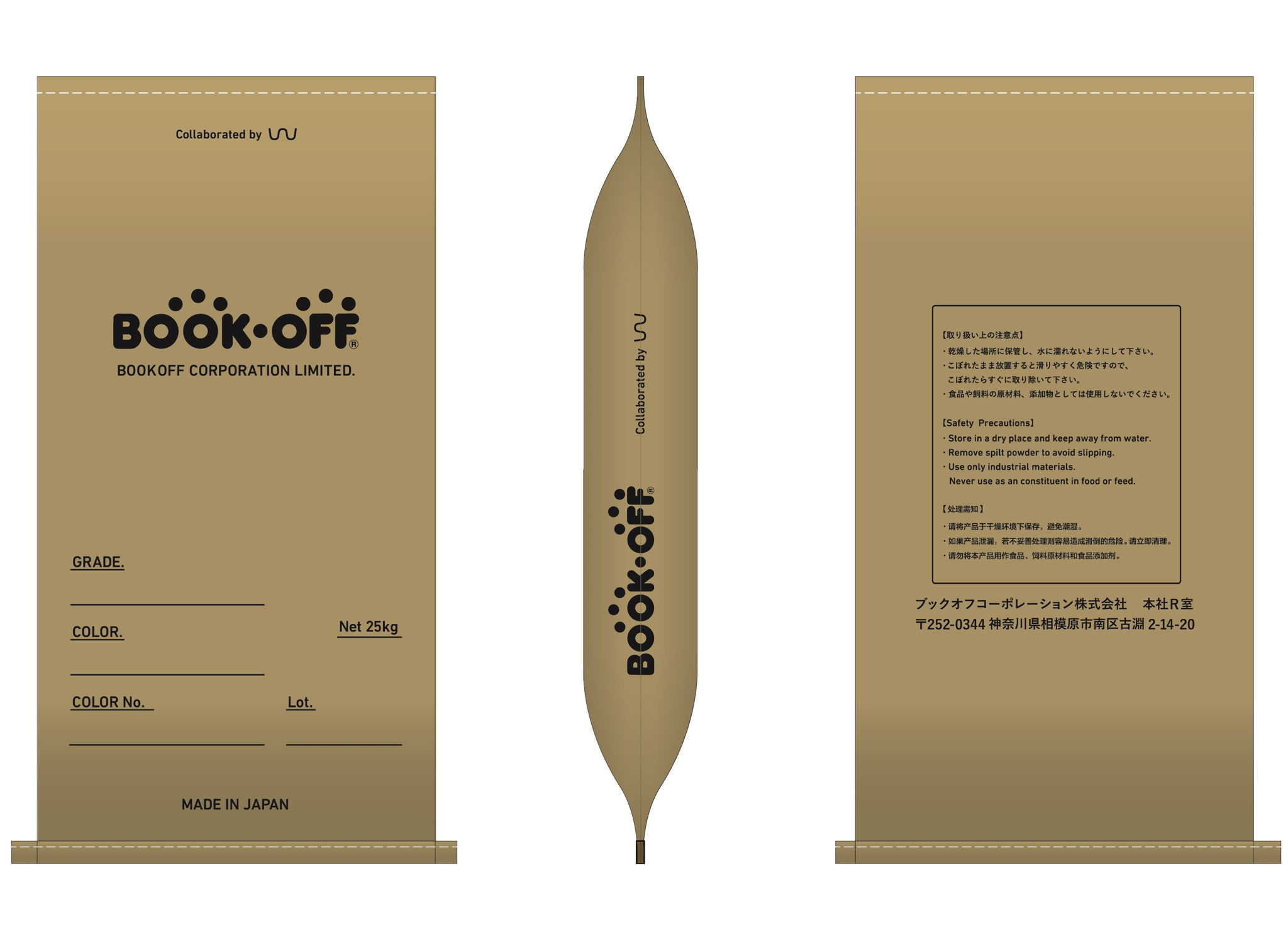 Due to the uncertain origin of the materials, typical recycled plastic bags are sold in plain bags, but 'CD plastic' resin paper bags prominently feature the 'BOOKOFF' logo."