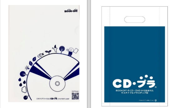 一般的にポストコンシューマーリサイクルが難しいと言われるのは素材・回収の「出所が不明」であることですが、「CDプラ」の特徴は「BOOKOFF」にて回収管理をしていることから、「由来が明確である」「素材の純度が高い」ことです。特に由来の明確さはユーザーにとって品質に対する安心感につながります。出所が不明ゆえに一般的な再生プラスチック資材は無地の袋で販売されていますが、「CDプラ」の袋には、「BOOKOFF」のロゴを大きく明記しています。