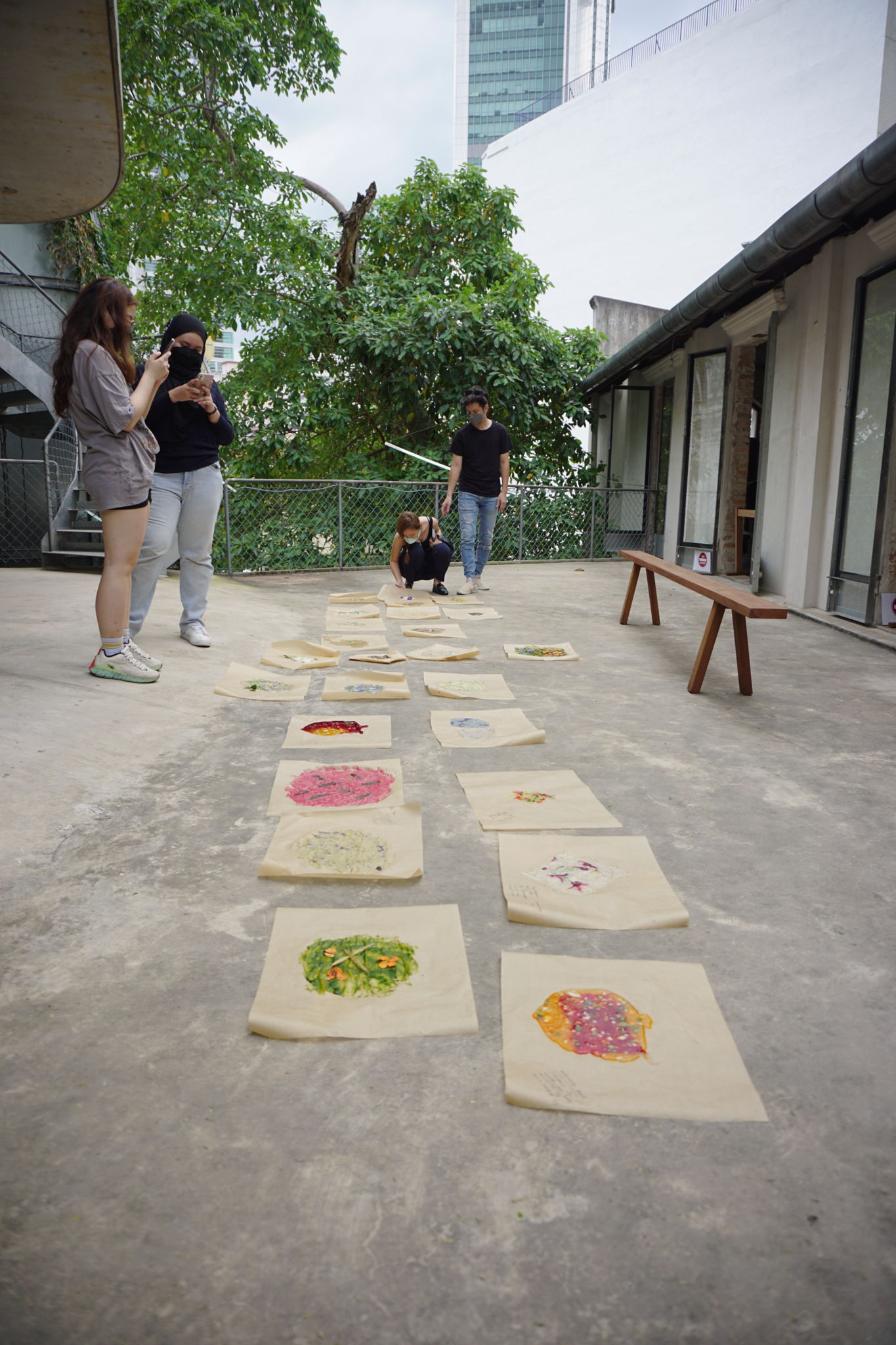 Participants were introduced to the fundamentals of what makes a material – polymers, plasticizer, fillers and expanding agents; and how the different quantities of the same ingredients will affect the physicality of the final material. During the workshop, the participants were also encouraged to pick up materials from around the area such as fallen leaves and flowers that could be added into their material to give it the extra texture, colours and even structure. The outcome of the workshop was very interesting as many different variations of materials were produced. While most of the participants got excited about using fallen leaves and flowers to make creative compositions in their material, some others came up with creative ways to add the flowers into the heating process thereby ‘accidentally’ extracting the colour pigment from the flowers and giving their material that extra tinge of colour (biochrome).