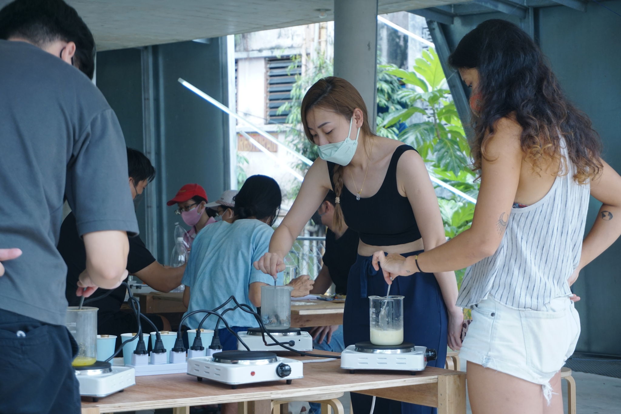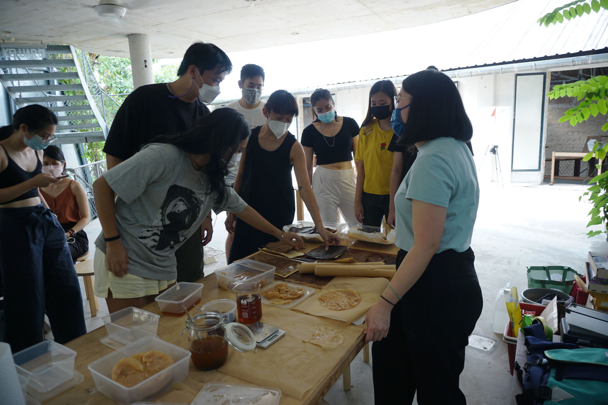 Bio-based materials here refer to using ingredients that are derived from living (or once-living organisms), most of which in our case are the regular suspects in your kitchen such as corn flour, agar agar and kitchen waste such as orange peel and used coffee grounds. Needless to say, the workshop set up looks very much like a cooking class.