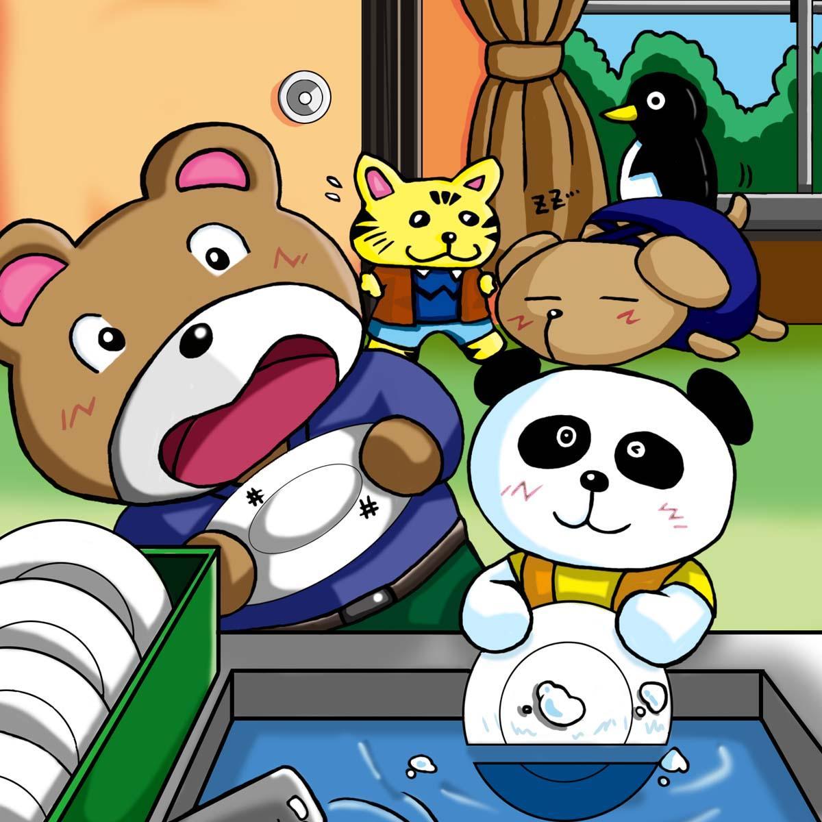 お皿洗いを手伝うよ。そこ、寝ちゃだめ~!