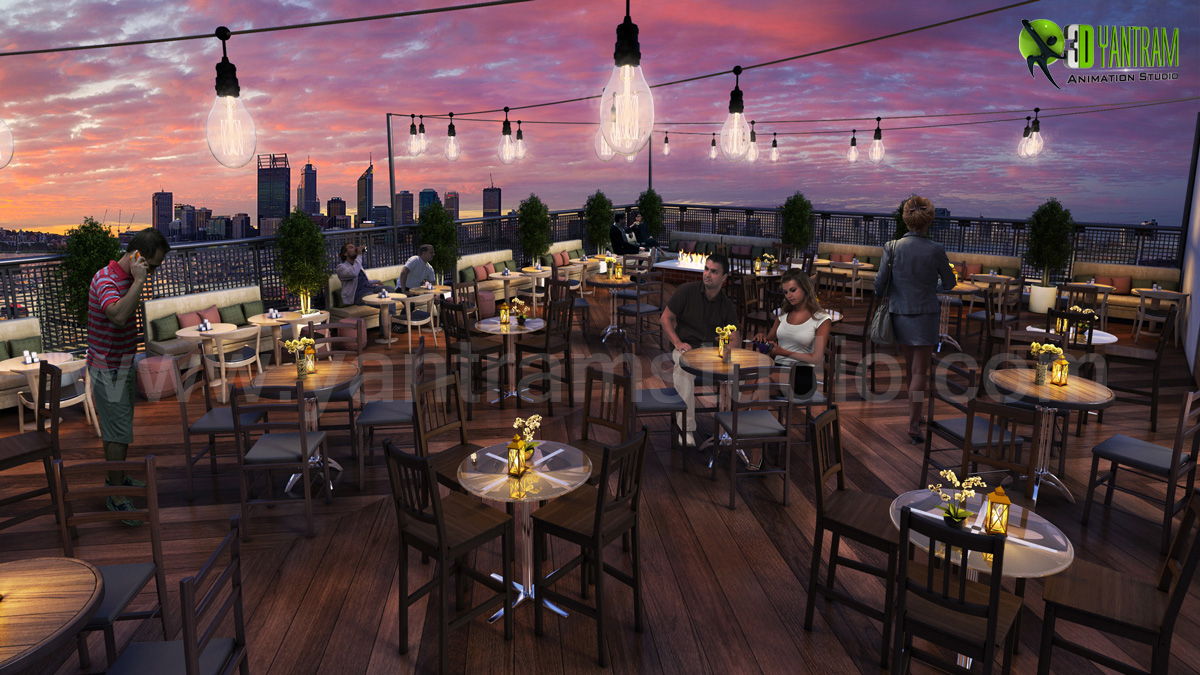 Rooftop Layout Lounge 3D Rendering Evening View by Yantram architectural visualisation studio Rome, Italy