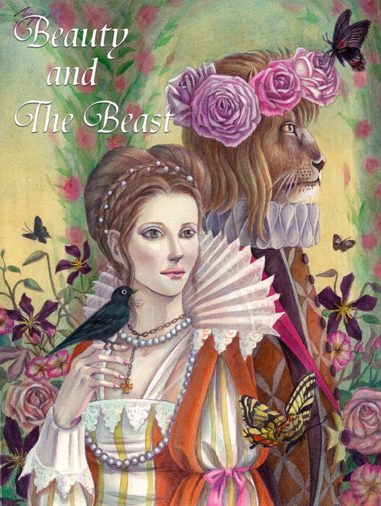 美女と野獣です。特にコンペ用でもなんでもなく、自由制作です。アルシュ紙に透明水彩でざっと描いてから透明度の高いアクリル絵の具で全体の空気を作りました。