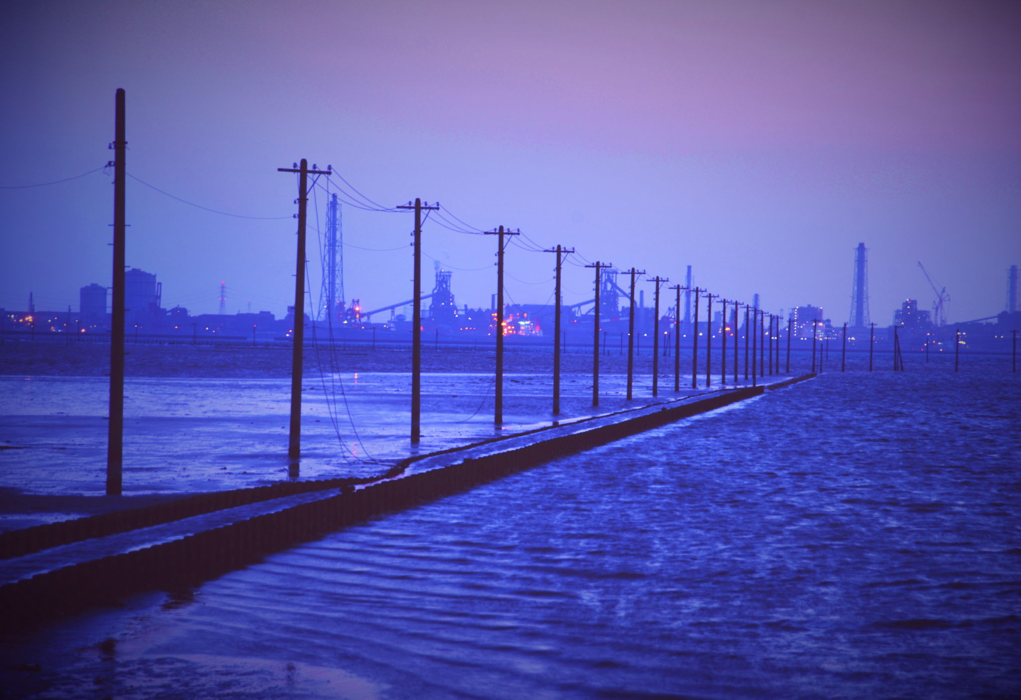 A telephone pole ranges forever to the offing in a sea with the evening color, indeed.