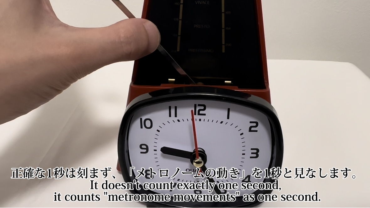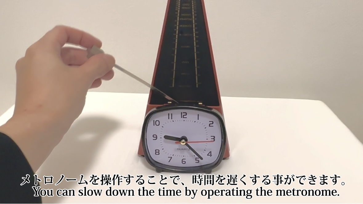 ツイスタイマーは仮想時間と現実時間を融合させる、SFチックなメディアアート作品です。人間の感覚時間というものは非常にあいまいで、例えば同じ音楽を聴いていても身体のコンディション等によりテンポが違って聞こえます。では逆に、自分のテンポに合わせて現実の時間速度が変わったら面白いのではないか?というのが本作のコンセプトです。メトロノーム型の振り子は現実時間(下部の時計)とリンクしており、テンポを変えると時計の速度も速くなったり遅くなったりします。ぜひこの時計を使って、皆さんもSF的時間感覚の面白さに触れてみてください。