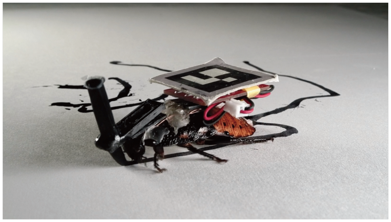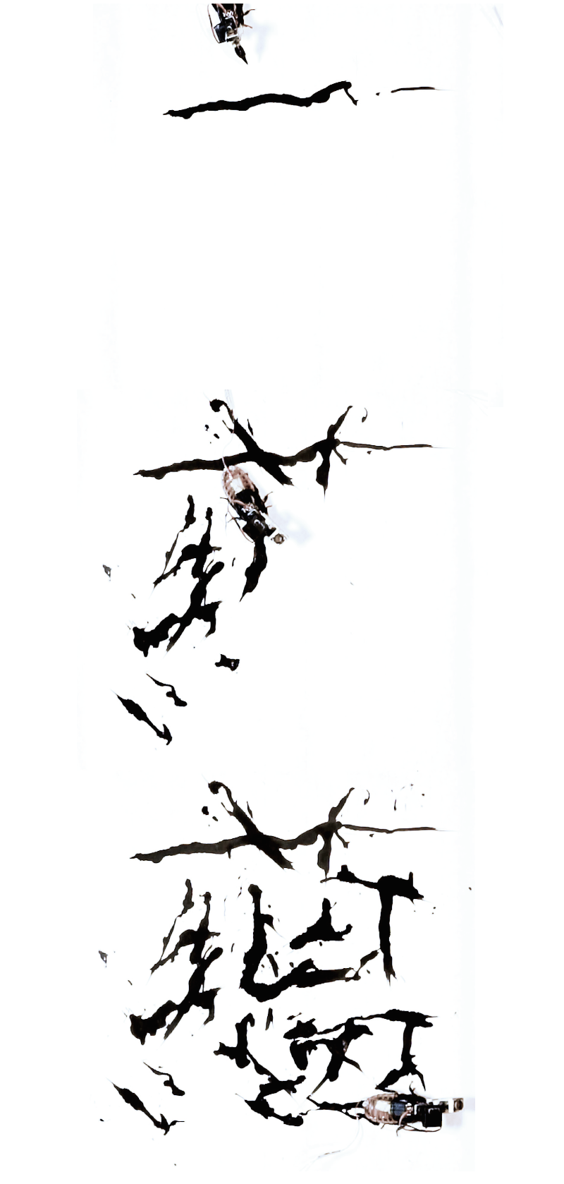 ゴキブリの自然な行動を電気刺激によって誘導し般若心経を書き上げる作品。