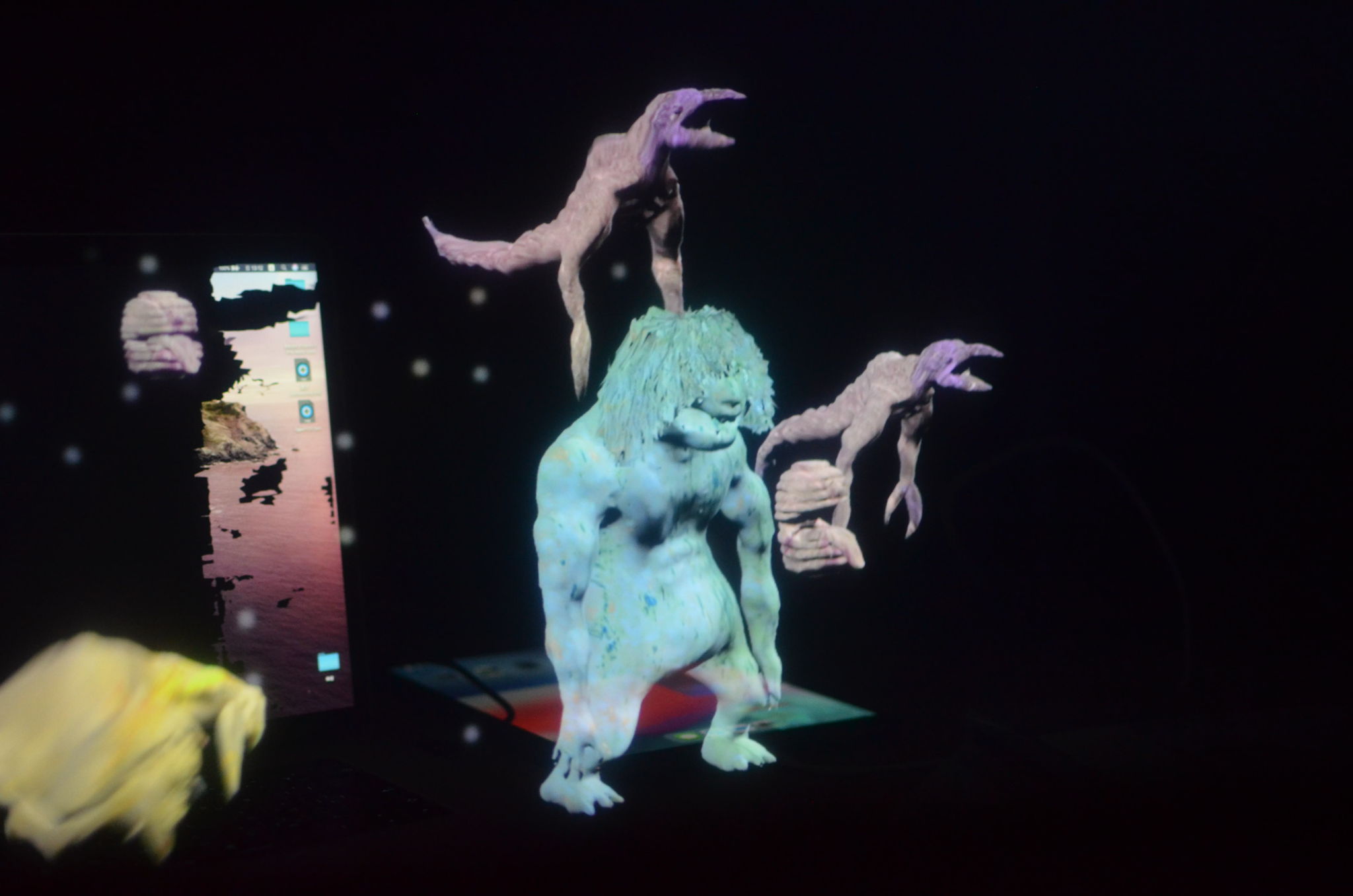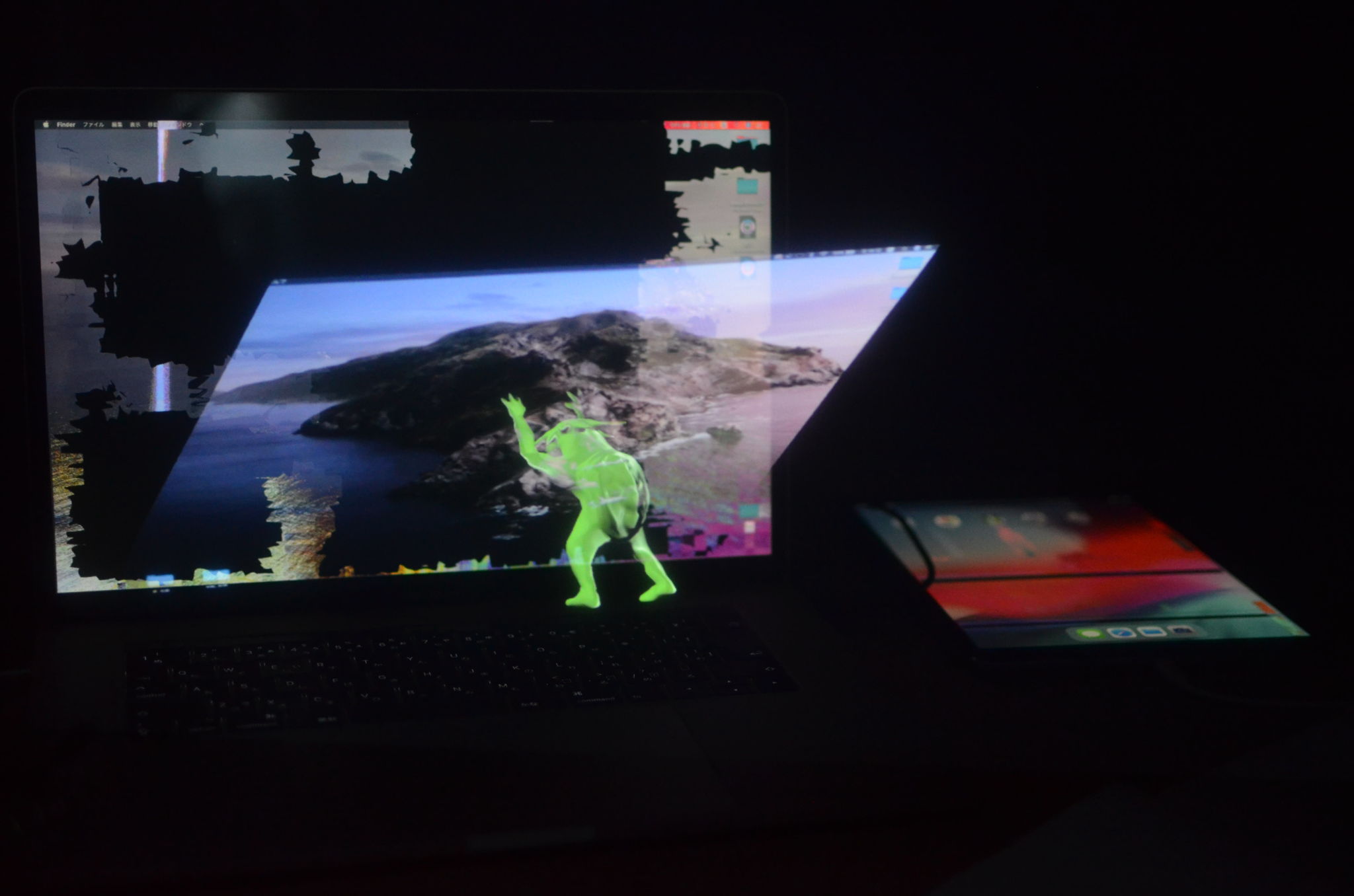 サイネージやPC、スマートフォンなどのデバイスは広く普及し、その存在は我々にとって当たり前のものとなりました。しかしこれだけ身近な存在となった今でも仕組みまで全てを理解して使用している人は多くいないと思います。そのため我々はデバイスに予期せぬエラーが起こると途端にこれを恐れてしまう。古来の人が 「山びこ」や「蜃気楼」など自然が起こす偉大で未知なる現象に畏敬の念を抱いてきた様に、身近であるが理解が及ばない現代の技術にも畏敬の念をもって接することはそれらのメディアを新たな視点で再考するきっかけになると考え、PCやタブレットにおきた予期せぬエラーに霊的存在を想像させる表現を用いて今回の映像インスタレーション作品を制作しました。