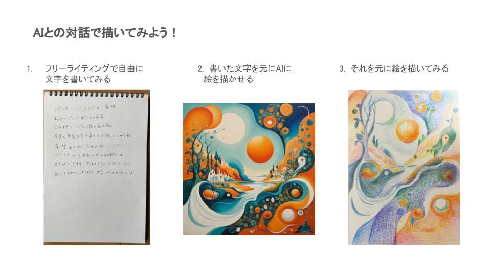 今回は、AI(人工知能)と対話して、実際にAIが描いた絵を真似して描いてみる、という企画です。対象は、老若男女問わず、様々な人に体験していただきたいと考えています。