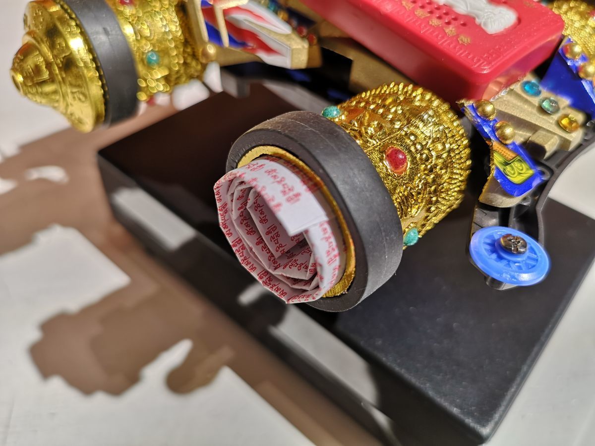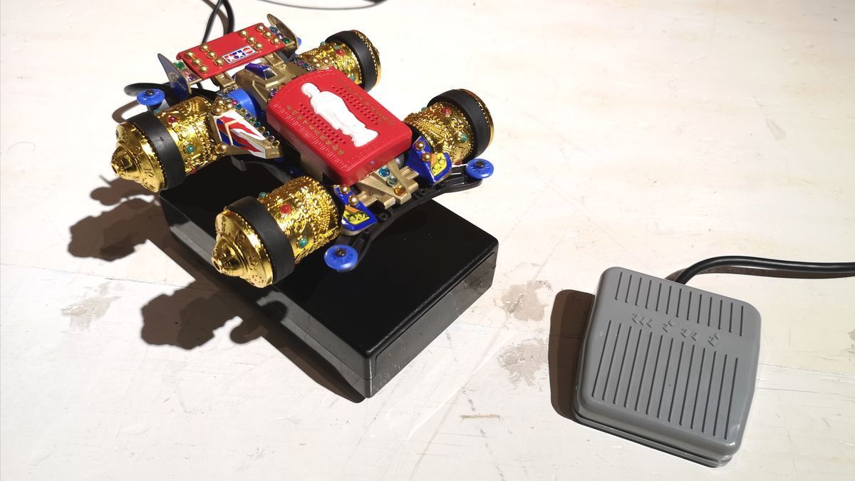 チベットや台湾では一般的な回すことで徳を積む事のできる仏具「マニ車」これを更に太陽光により自動化した「ソーラーマニ車」、これを玩具の「ミニ四駆」の車輪に4輪採用、アクセルペダルを踏み込むことで発進し、マニ車を4輪駆動かつ高速回転させることにより、解脱まっしぐらなマシン「マニ四駆」がここに誕生しました。