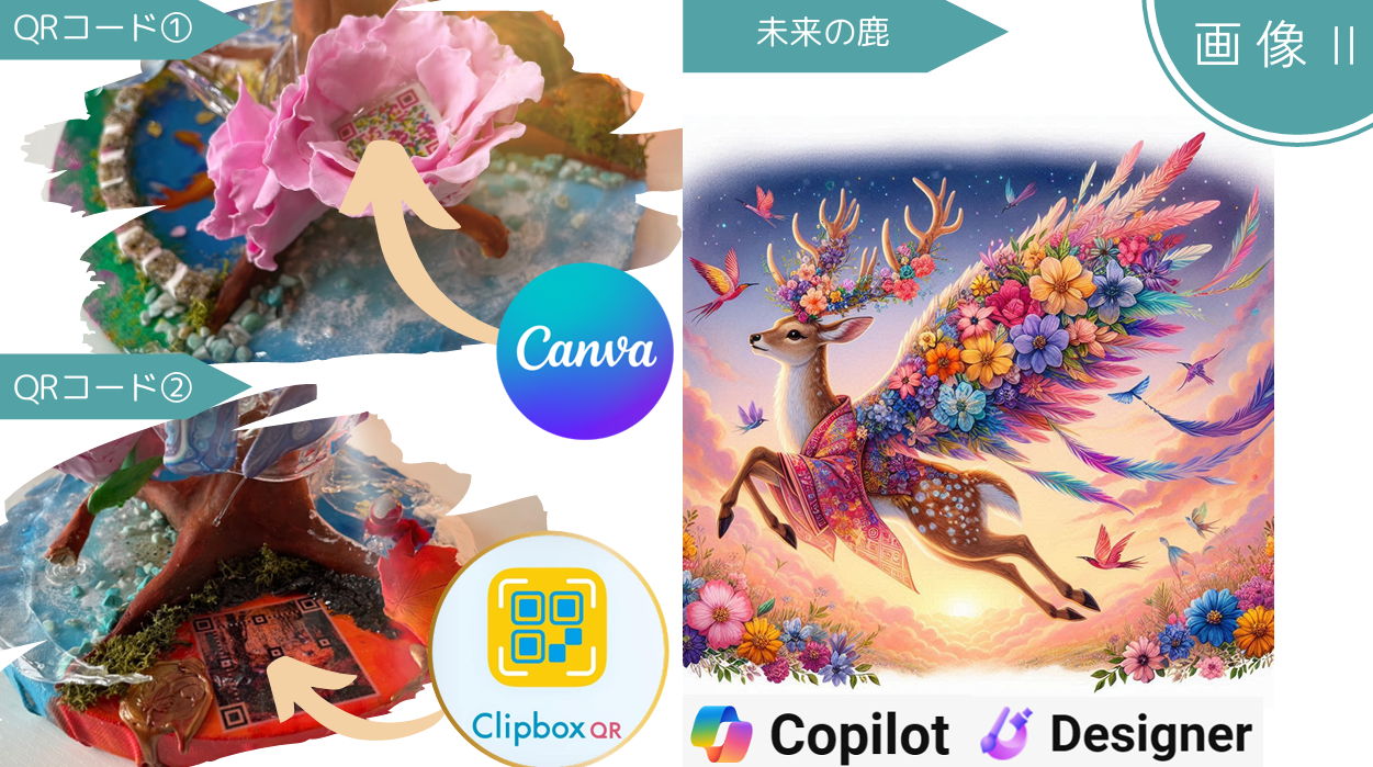 AIを用いてイラストやQRコードを生成したものと、主に紙粘土やレジンを用いて作った立体物の二つで構成されています。(画像Ⅰ)