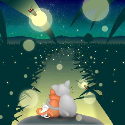 初夏の夜、猫の一家は夜のお散歩です。田んぼではカエルが歌い、小川には蛍が舞っています。猫の一家は小川の岩に腰を下ろし、しばし休憩。蛍の灯火が夏の夜のキャンバスを静かに描きます。猫の一家も蛍の灯火を楽しんでいるのでしょうね。
