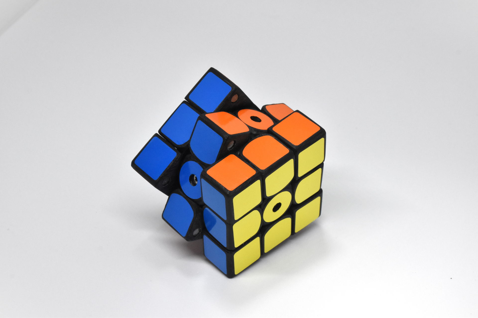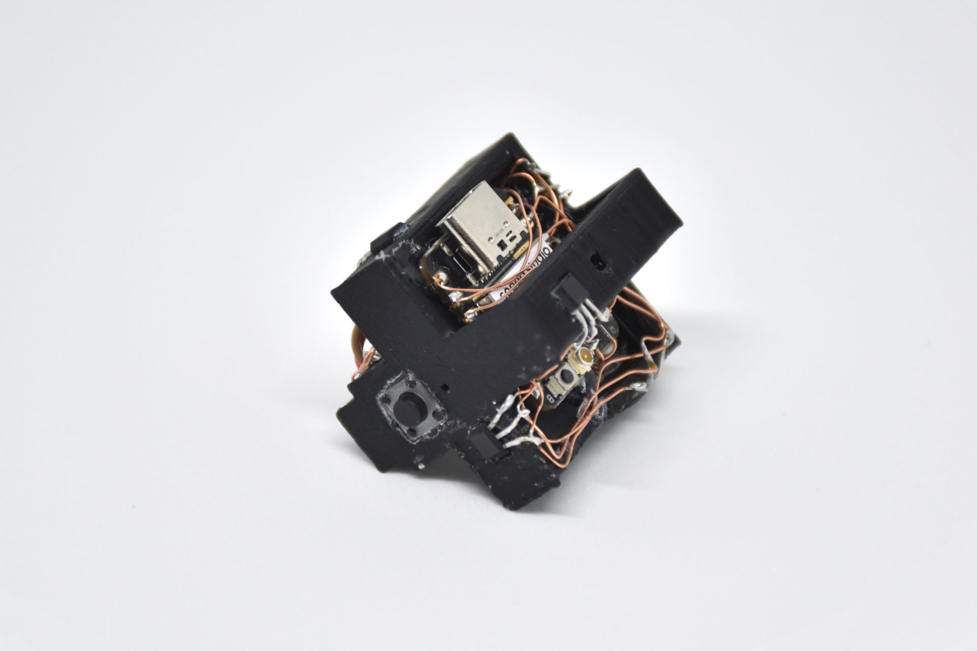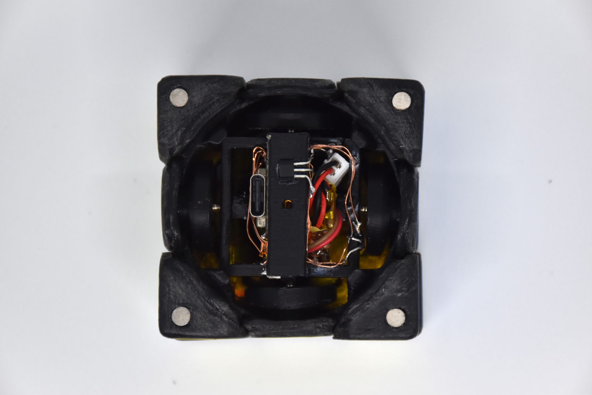 この作品はパズル自体の設計・制作から電子回路、ソフトウェアの制作まで全て一人で行いました。一辺5.6cmの小さなパズルの中に電子回路を埋め込めるよう空間を配置し、3Dプリンタでパズルを作りました。そして、その小さな空間に電子回路を詰め込み、無線通信によってパソコンから音が鳴らせるようにしました。音色も音階も自由自在です。しかも、とても回しやすいです。