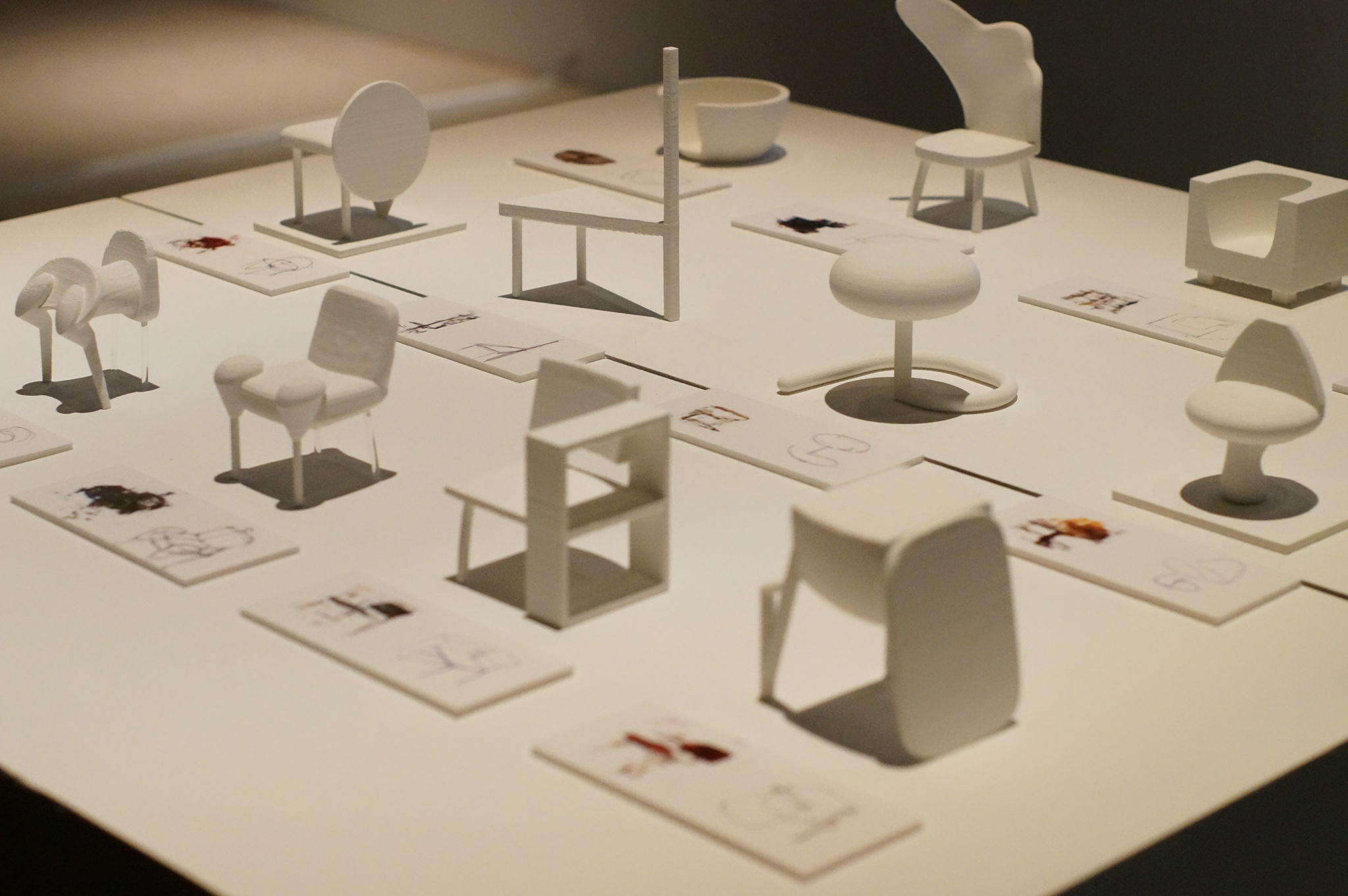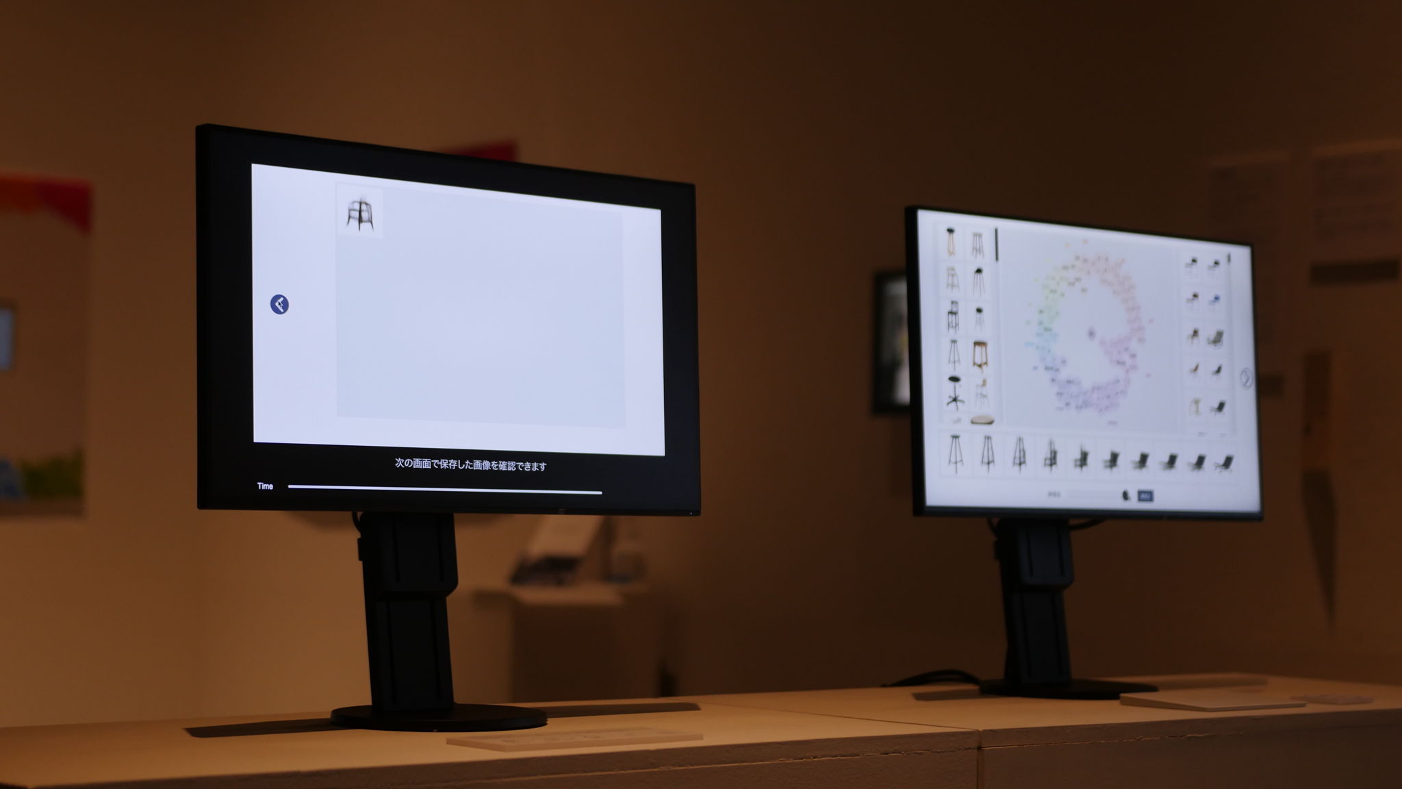 椅子と任意に選んだ別のものを混ぜ合わせ曖昧な画像を生成するツール《Latent Space Explorer》を制作しました。その後、椅⼦のデザインから制作まで行ったことがある4名のデザイナーにデザインのアイデアにつながる画像を見つけ出してもらい、椅子のスケッチを描いてもらいました。最後にスケッチを3次元モデルにして3Dプリンターで出力しました。