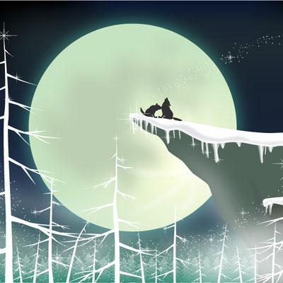 吐息さえも凍てつく北欧の月夜。オオカミのカップルは真夜中のデートです。静寂の月明かりの中、オオカミの遠吠が響き渡ります。哀愁漂う鳴き声は、オオカミのラブソングなのかも知れませんネ。Wolf Songは澄んだ風にのって森に広がります。
