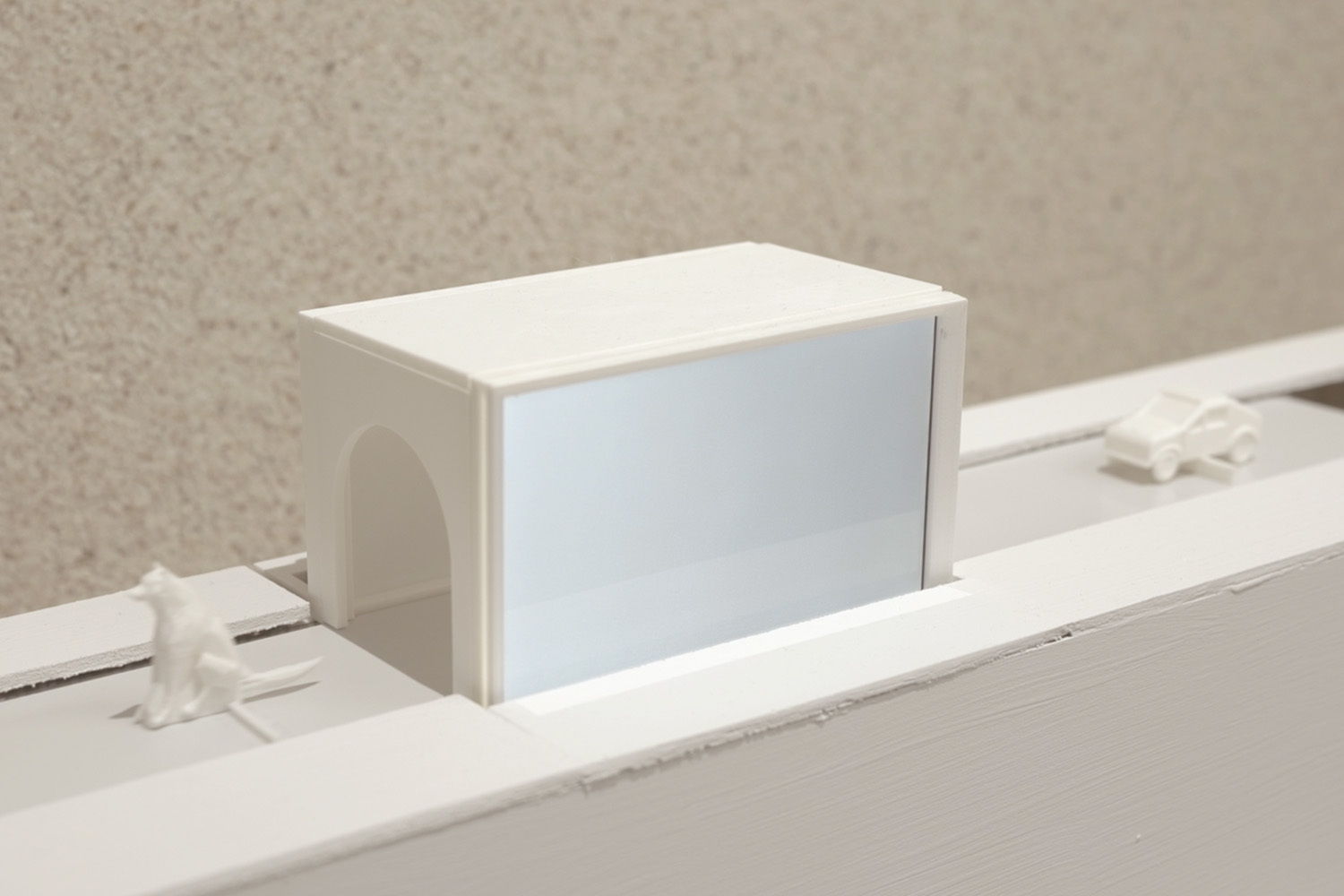 直線移動する物体の運動の一部を隠し、隠れた部分の物体の移動をシルエットを使った映像で表現する装置。 物理と映像の動きの切り替わる瞬間を魅せることに注目した作品。