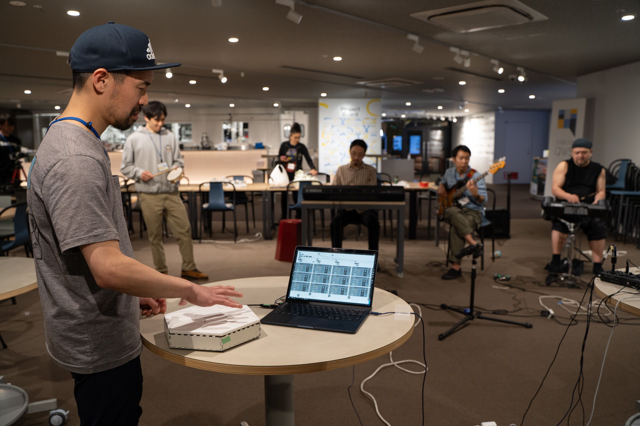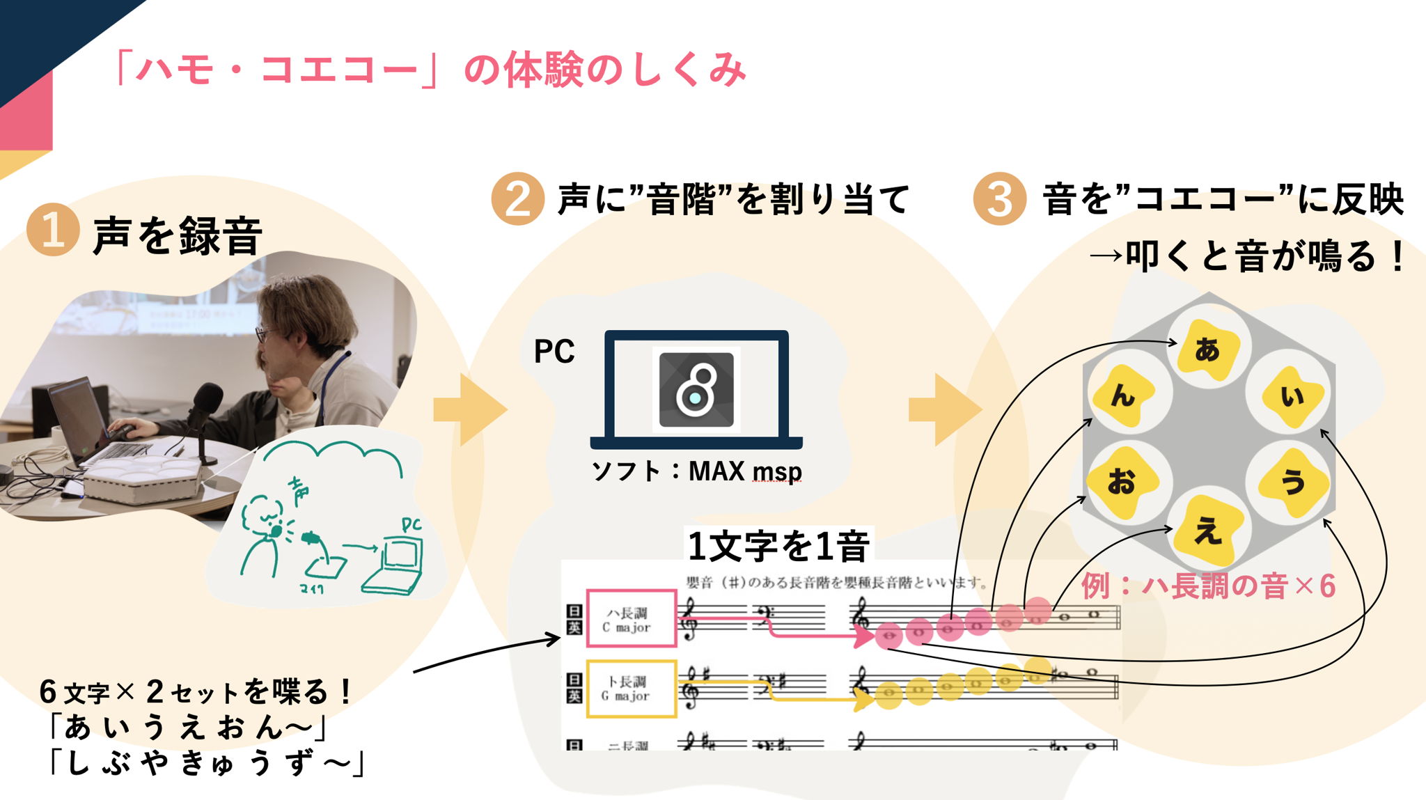 オリジナル楽器のコエコー。楽器が演奏できなくても演奏を楽しみたい初心者のために制作しました。これを使えば、楽器初心者でも他の人と一緒に演奏して音楽を楽しむことができます。音階を自動設定し、不協和音を防ぐことで、初心者が理解しづらい音階のハードルをなくしています。また、自分の声を音色にすることで、自分の楽器への愛着を強め、音楽演奏に主体的に取り組むことができます。具体的には、まず自分の声をコエコーのパッドの1音に割り当てます。マイクで自分の声を録音し、例えば「たなかたろう」や「バナナメロン」など、自分が思い入れのある言葉を使います。その1音1音にPC上で音階を割り当て、それをコエコーに反映させます。自分の声をコエコーに割り当てたら、実際に楽器として使用することができます。2つのコエコーを組み合わせてハモリの音階を設定し、一緒にハモることが可能です。