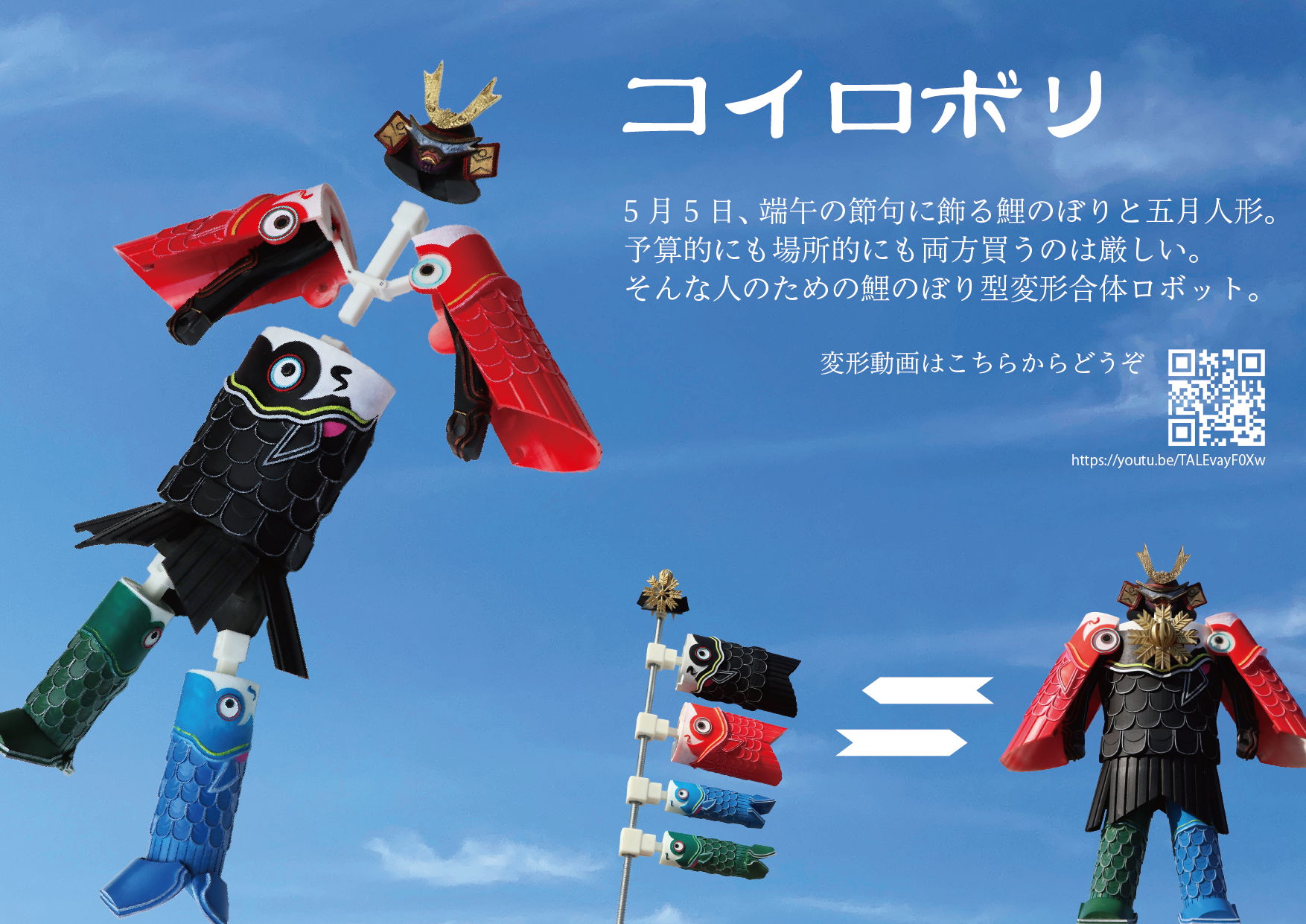 5月5日、端午の節句に飾る鯉のぼりと五月人形。予算的にも場所的にも両方買うのは厳しい。「コイロボリ」はそんな人のための鯉のぼり型変形合体ロボットです。鯉のぼりモードから五月人形モードへと変形するこのロボットで端午の節句を心置きなく楽しみましょう。