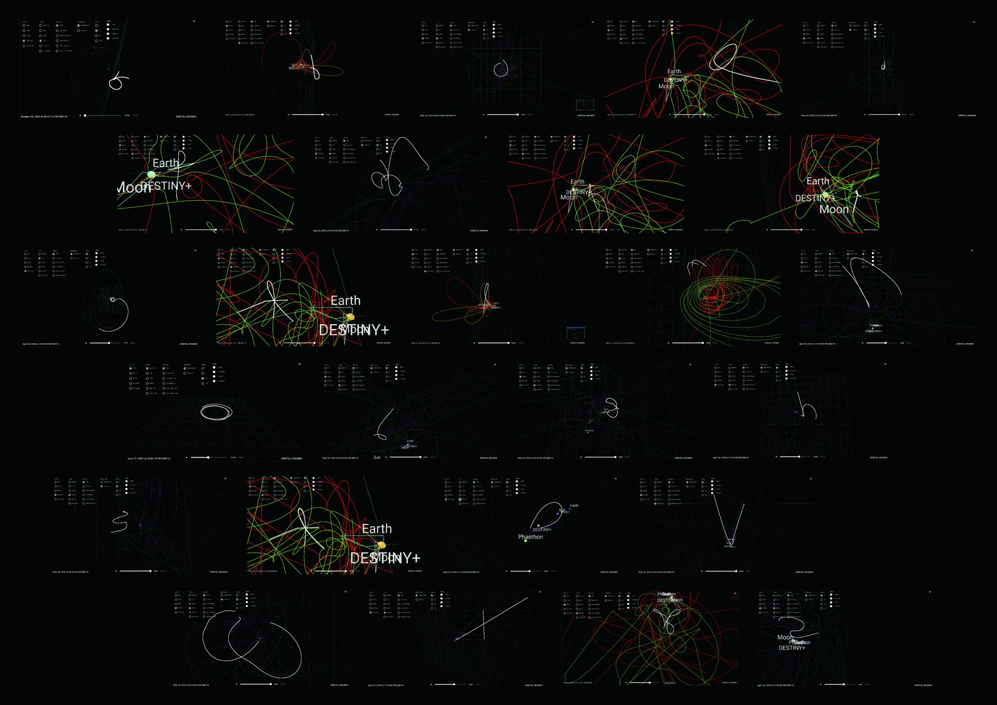 プロジェクト中に、3次元の宇宙機の軌道をいろんな視点や角度から見ていると、2次元上でアルファベットみたいに見える軌跡があることに気付きました。そこからアイデアが生まれ、特定の視点や角度で交差する軌道の線がアルファベットに見える瞬間をスクリーンショットでキャッチし、その線を抽出していきました。