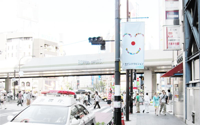 国内でも国際交流が盛んな六本木の街を国旗に例え、テーマの"笑顔"を描きました。日本を中心に世界が繋がってほしいという願いを込めて。