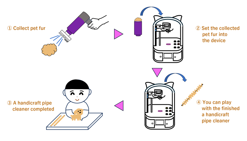 The background of this study lies in the current situation where large amounts of pet fur, such as from dogs and cats, are being discarded. Compared to cashmere or wool, pet fur is harder, thicker, and lacks flexibility, making it difficult to process and therefore less likely to be reused. However, we believed that if pet fur could be transformed into a form that is easy for anyone to work with, and made into items that pet owners can feel connected to, it would not only reduce waste but also create special memories for owners. Therefore, we designed a device to upcycle pet fur into handicraft pipe cleaners.
