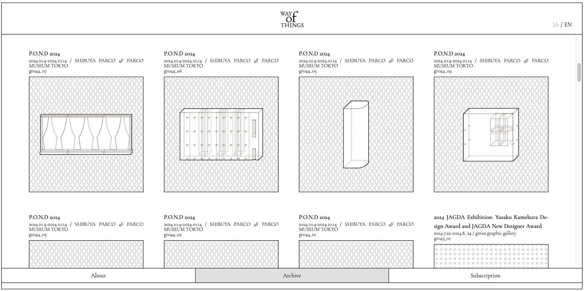 The latest information on exhibitions designed by members of 'Way of Things' will be available online. Drawings with measurements will also be provided online, which can be useful when considering the acquisition of 'things.'