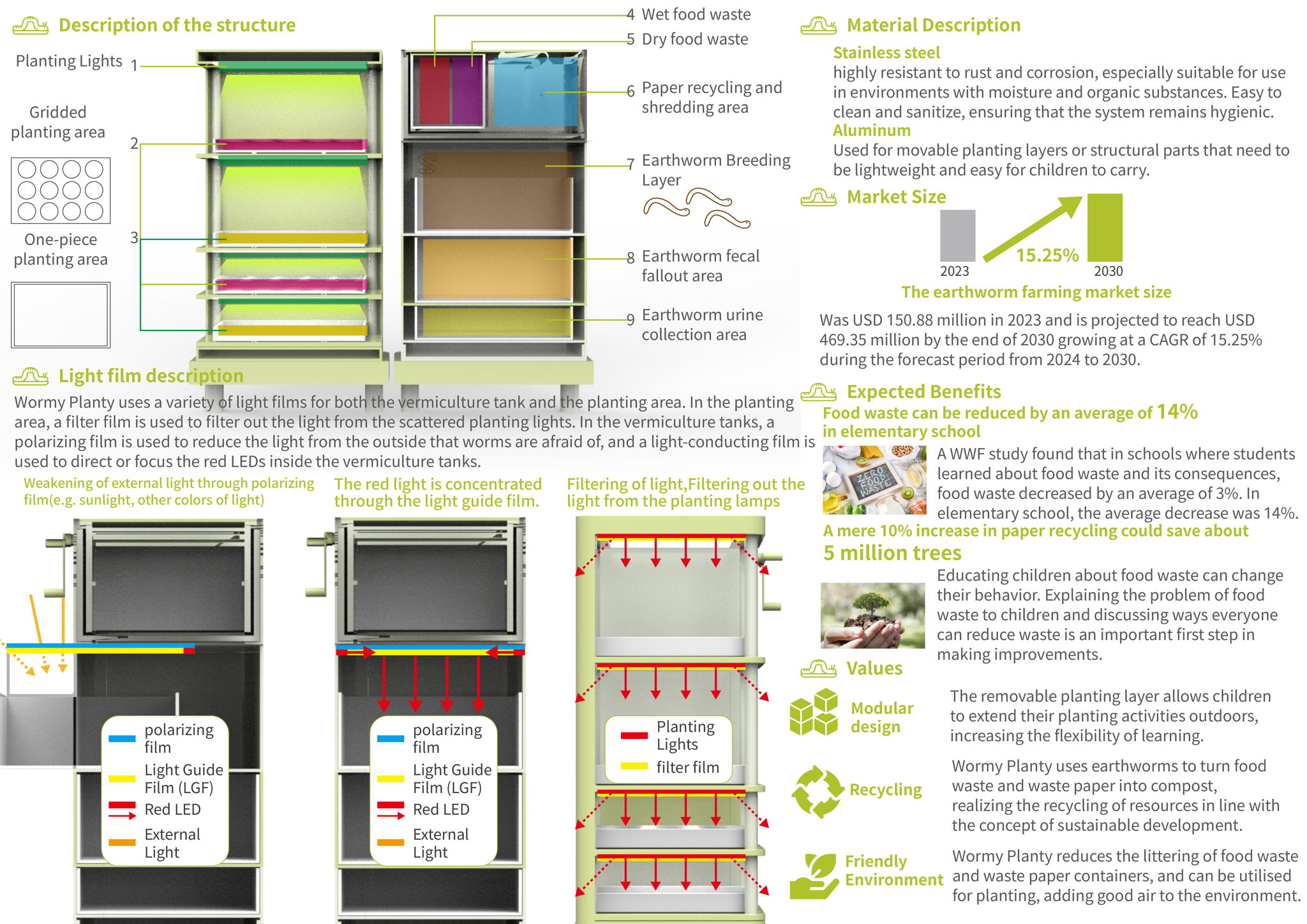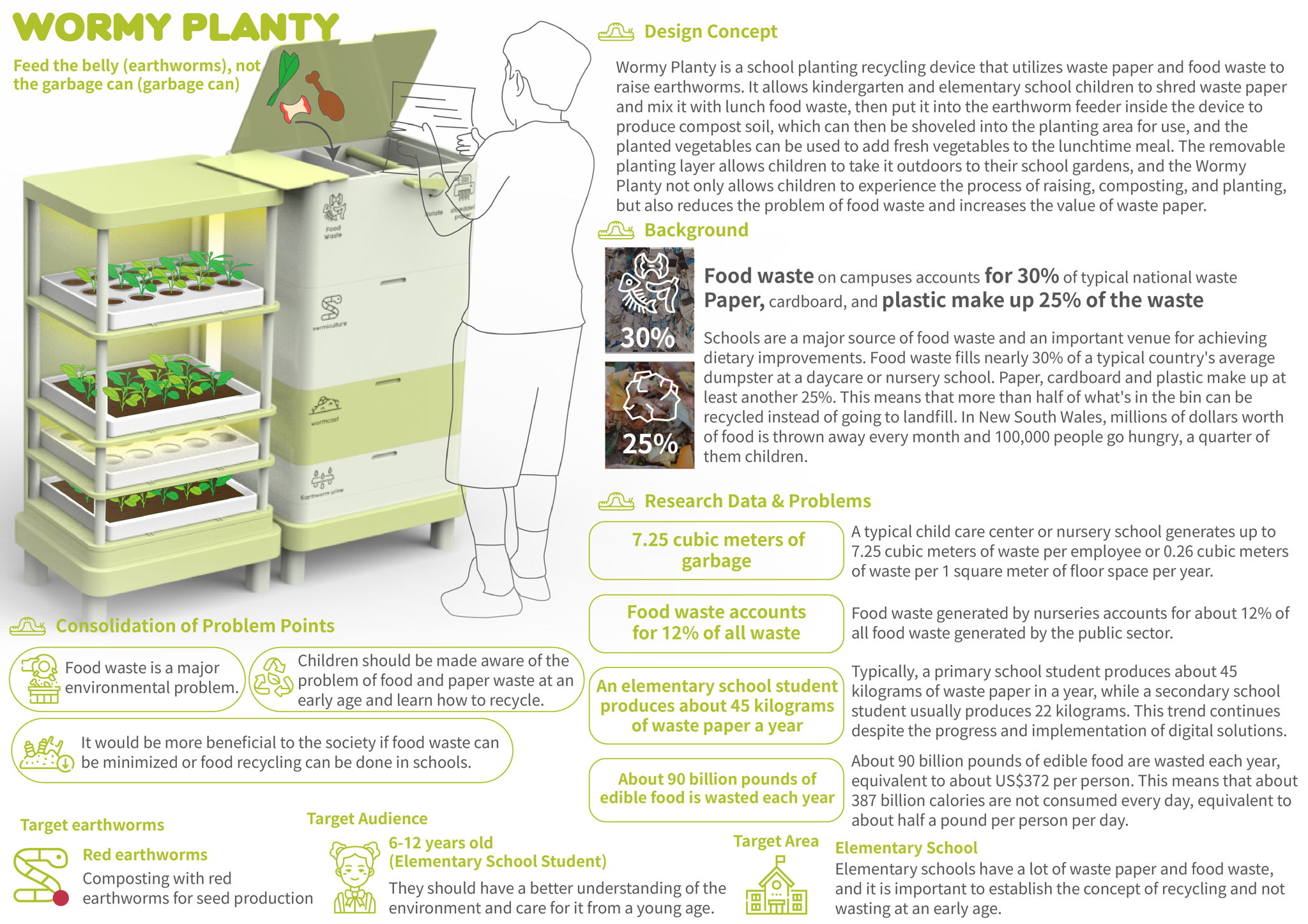 Wormy Planty is a school planting recycling device that utilizes waste paper and food waste to raise earthworms. It allows elementary school children to shred waste paper and mix it with lunch food waste, then put it into the earthworm feeding tank inside the device to produce composted soil, which can then be shoveled into the planting area for use, and the planted vegetables can be used to add fresh vegetables to their lunch. The removable planting layer allows children to take it outdoors to their school gardens, and the Wormy Planty not only allows children to experience the process of raising, composting, and planting, but also reduces the problem of food waste and increases the value of waste paper.