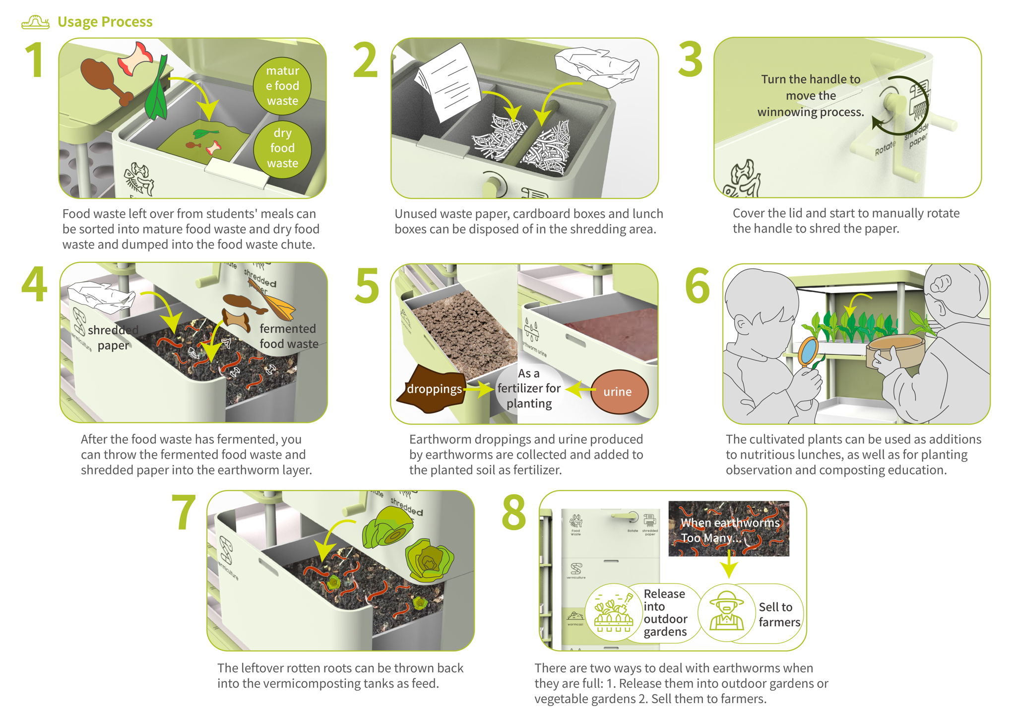 Wormy Planty uses the composting ability of red earthworms to turn food waste and waste paper into nutritious compost, making the soil healthier and the finished vegetables edible, as well as plants to freshen up the air and reduce carbon dioxide, and uneaten food can be thrown back into the worm bin to be composted again, making a green cycle.