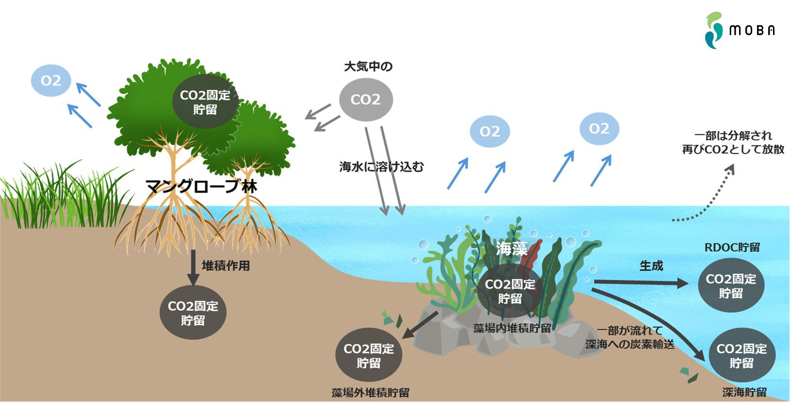 私たちはこれまで、藻場の再生に有効とされるフルボ酸鉄を活用し、 海洋環境の回復を目指して藻場造成の実証実験を行ってきました。 そして藻場造成をひとつの大きな事業ととらえ、「MOBA農場」を地域のシンボル産業とするべく取り組んでまいります。「MOBA農場」 は、 農場建設(藻場再生・造成)からはじまり、藻場で固定したブルーカーボンクレジットの創出・販売、藻や磯焼け対策として捕獲したウニの製品化、農場の管理・保全やCO2固定量のモニタリング等、オペレーション、マーチャンダイズ、メンテナンスまでを包括的に行う事業となります。地域特性を考慮し、各地域が持続的且つ自立的な藻場再生を実現することにより、事業機会や雇用創出など含め地域創生の出口戦略まで見据えた包括的な地域活性化策を提案する「MOBA農場」を積極的に推進してまいります。