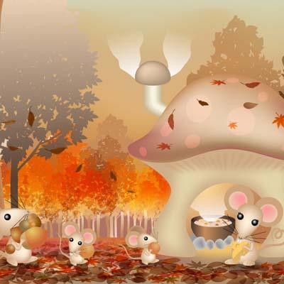 秋の深まる林の中、きのこの家に住むネズミの親子は、晩ご飯の準備中です。お父さんネズミと一緒に、子ネズミたちも木の実を拾ってきました。あったかいお家の中で、美味しいご飯を食べた後の、デザートにするのかな?