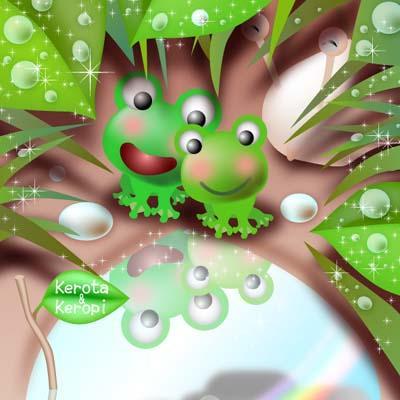 カタツムリに乗ってスロードライブを楽しんだカエルのカップル。お互いの気持ちが通じて、一緒に暮らすことになりました。ちょっと小さいけれど、かわいらしいハートのお家も見つけ、新しい生活にカエルたちも太陽も輝いています。