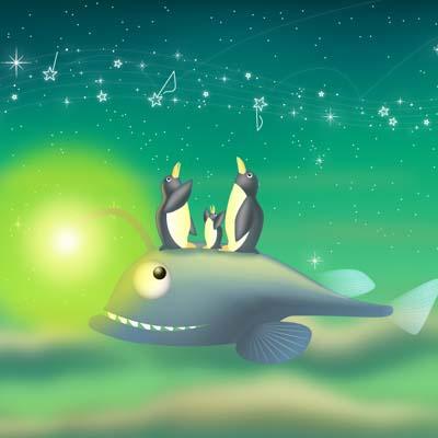 静かな静かな月の夜、ペンギン親子はアンコウ飛行機に乗って、夜のフライトです。夜空には月がかけた五線譜に、流れ星が当たって透きとおった音を奏でます。静かな月夜に流れる、流れ星のオルゴール。心まで透きとおる音色なのでしょうね。