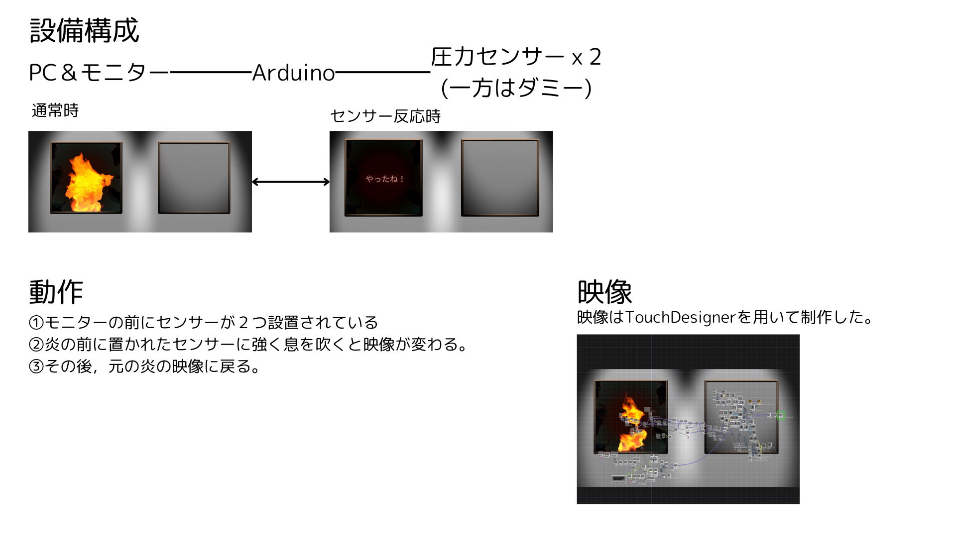 作品には二つの額縁が並べられている。一方の額縁には燃え盛る炎が映し出され、もう一方の額縁は何も描かれていない白紙のままである。観客の前には二つの気圧センサーが設置されており、炎の額縁の前にあるセンサーに息を吹きかけると炎は消える。しかし、白紙の額縁の前にあるセンサーに息を吹きかけても、何の変化も起こらない。