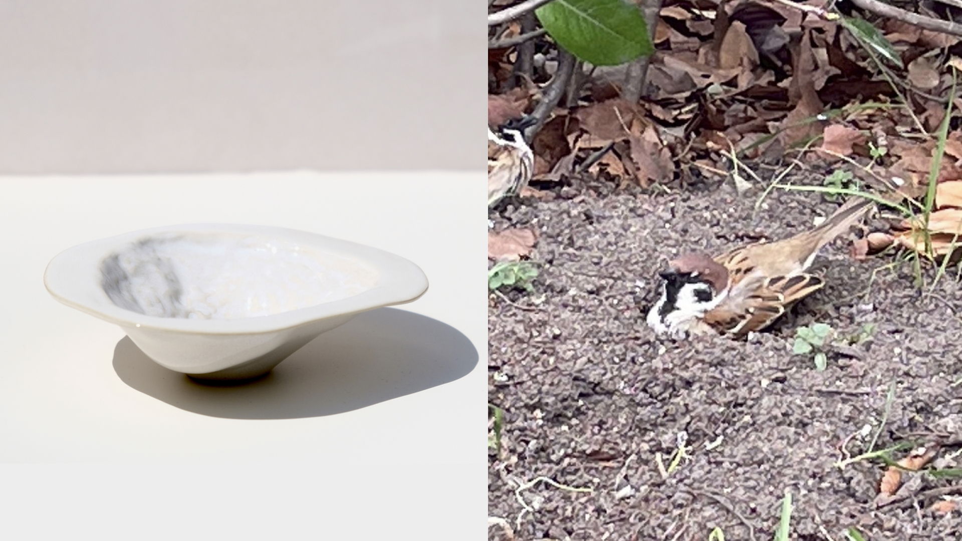 本作は、そんなスズメが砂浴びをした時にできる自然なかたちを器(うつわ)にしたものです。