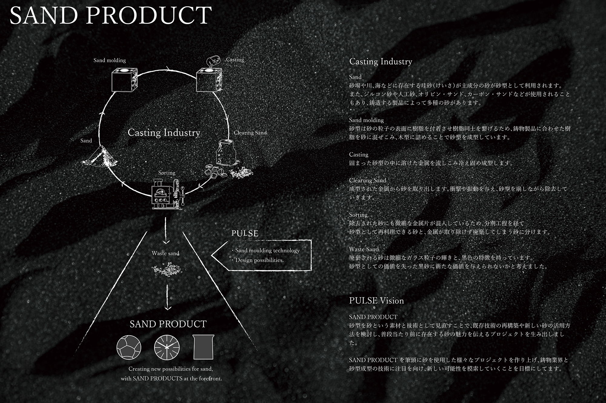 そこで私たちは、砂型を単なるものづくりの道具として捉えるのではなく、砂型成型の技術と砂という素材として捉えることで新たな価値を与えられないかと考えました。