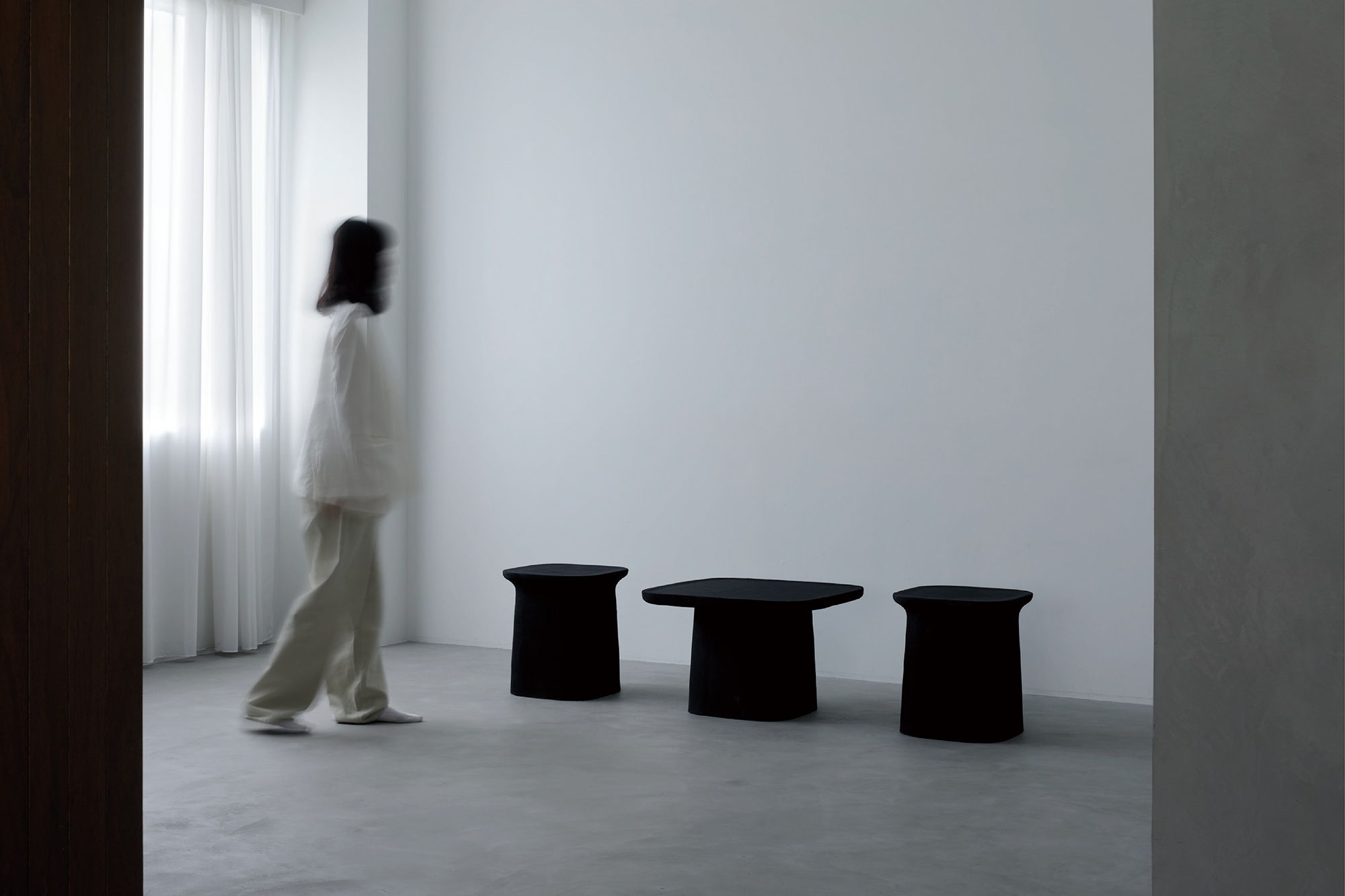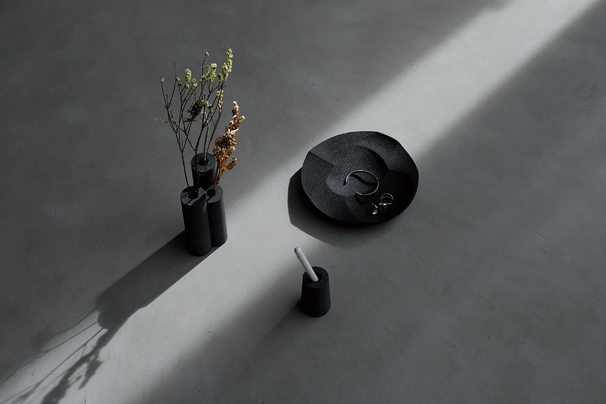 SAND PRODUCTの「OUTLINE」は、世の中に存在する製品の輪郭をトレースしたプロダクトシリーズです。砂型として製品の形状を生み出してきた素材に世の中に存在する製品の輪郭をトレースすることで、現れた造形に新たな機能が生まれ、黒く重厚感のある素材は異質な存在感を放ちます。家具と日用品に展開することで、人々の日常生活を"黒く彩る"デザインです。