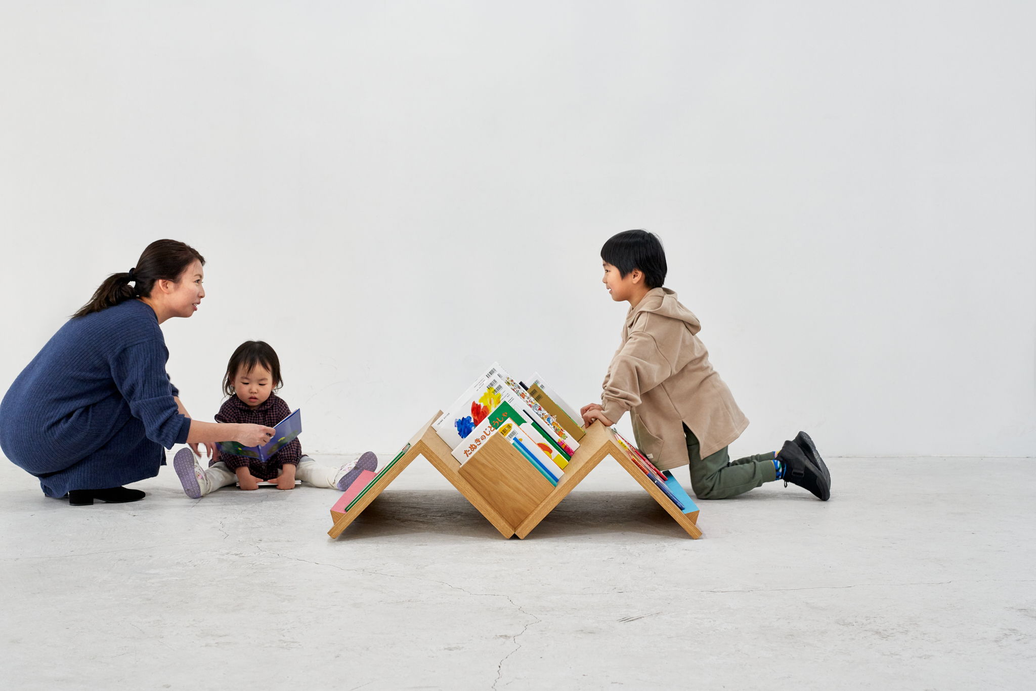 この設計により、大人と子どもの視線の高さの差を意識せずに本を選ぶことができ、子どもが自分の意思で本を見つけ、手に取り、読むという一連の行為が自然に行えます。