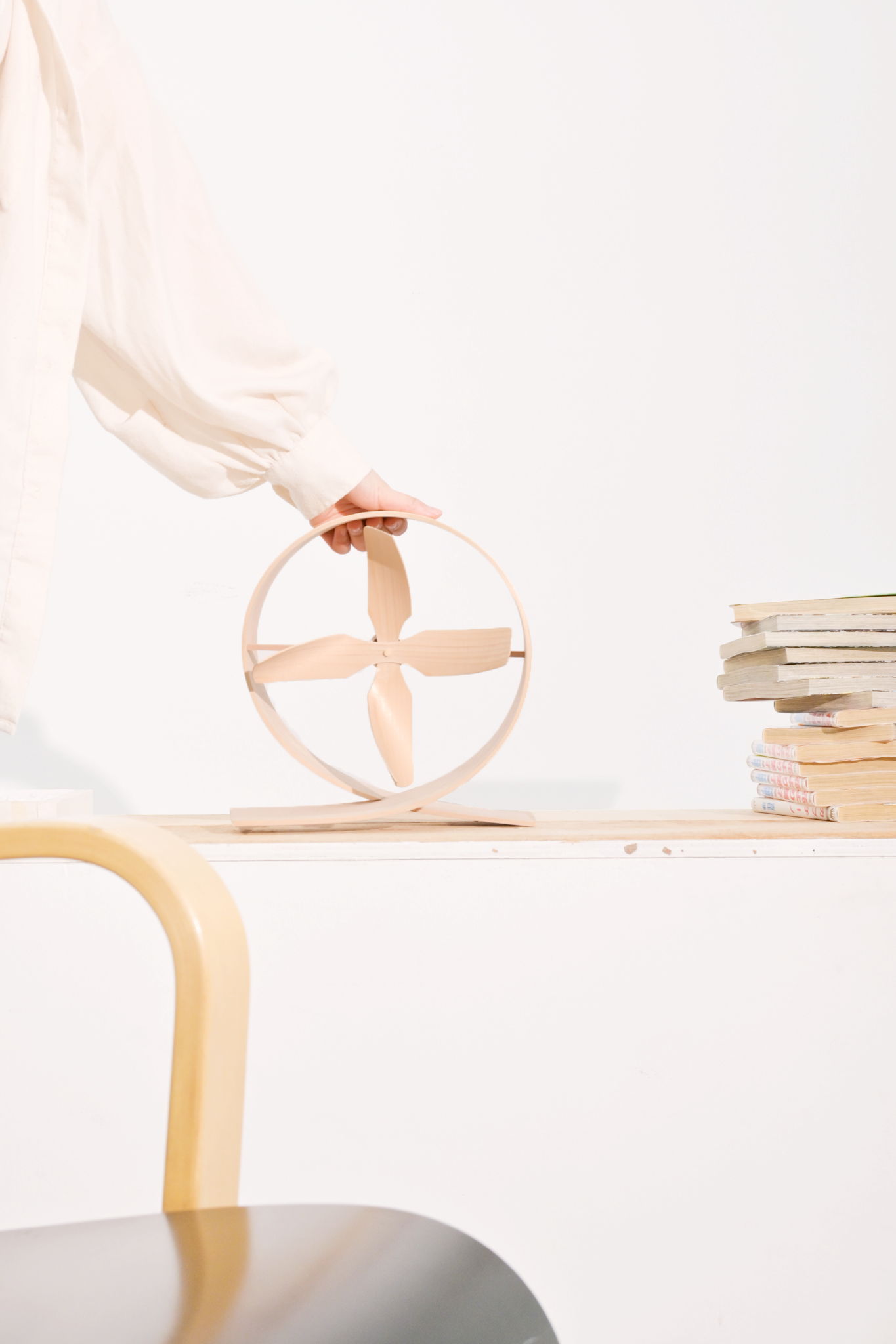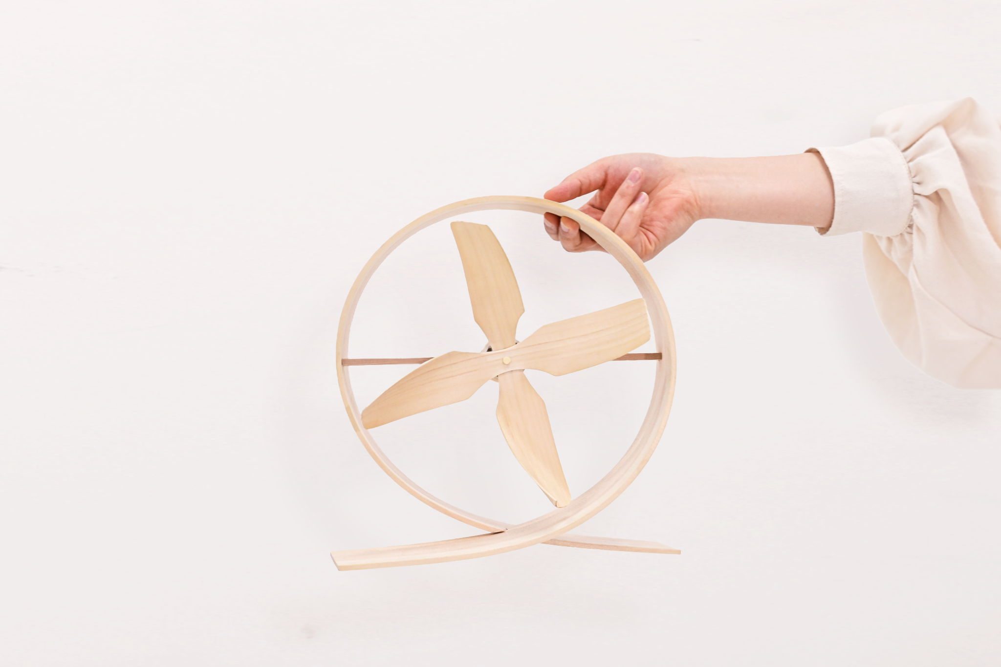 薄いヒノキ板をダイナミックに曲げることで得たアイコニックなデザインは、「曲げ木のしなやかさ」を印象づけます。MAGE FANのやわらかで心地よい自然の風は、人々の五感を穏やかに刺激します。また、扇風機として使わない時でも、天然木の温かさや、使い込むことで風合いの変化を楽しめるインテリアとして特別な存在感を放ちます。